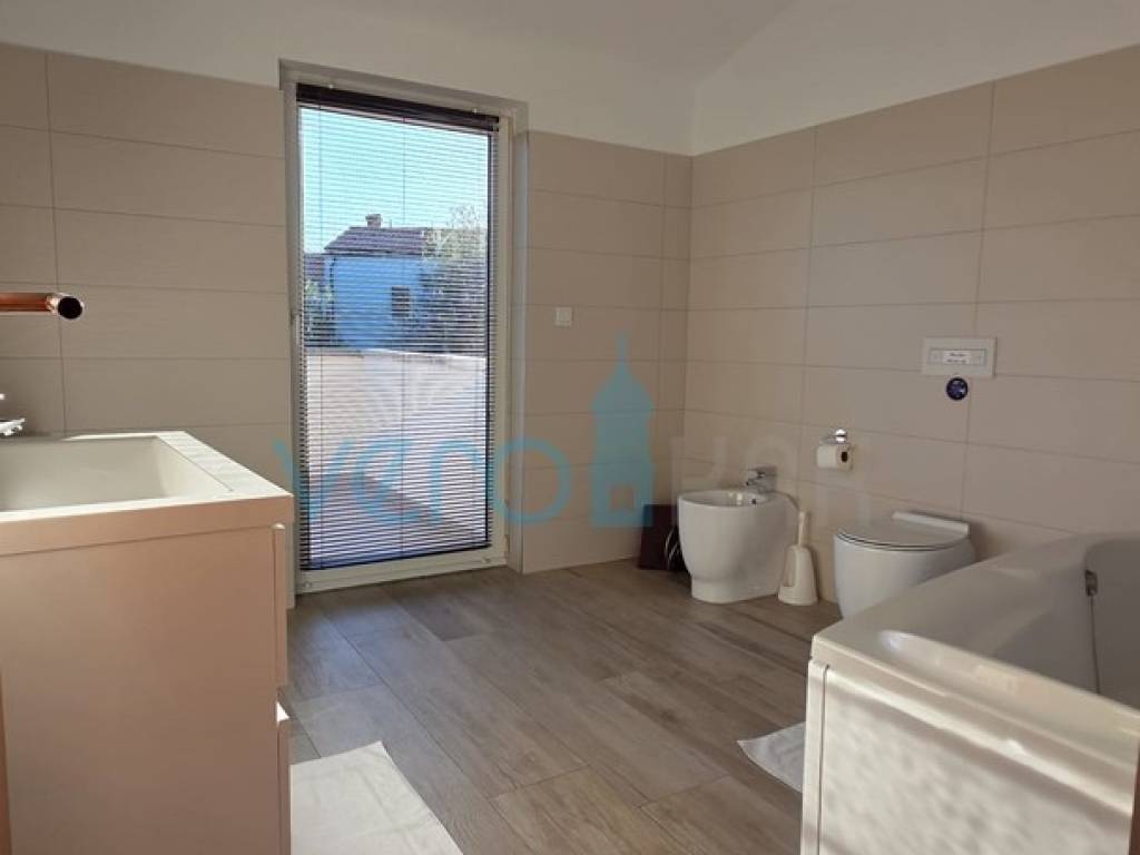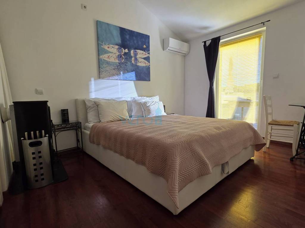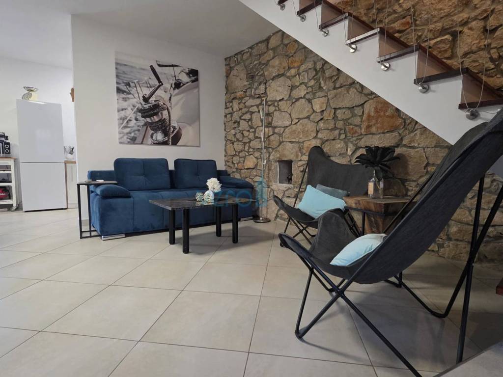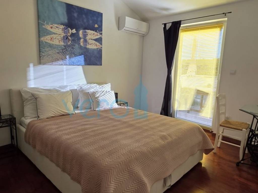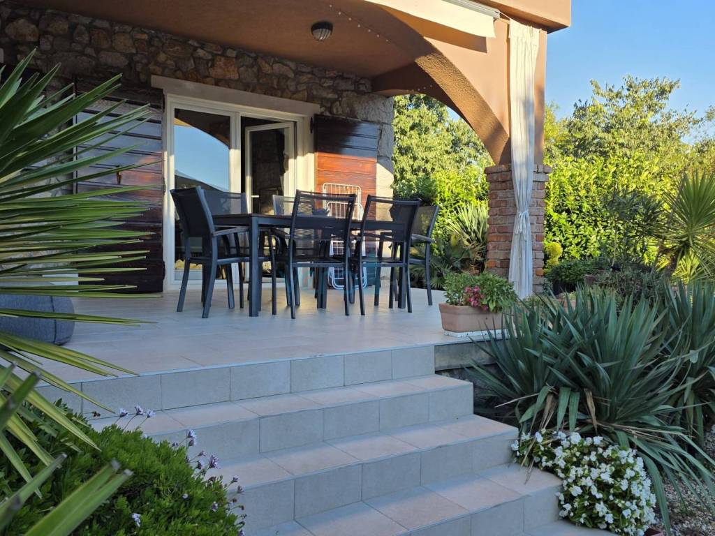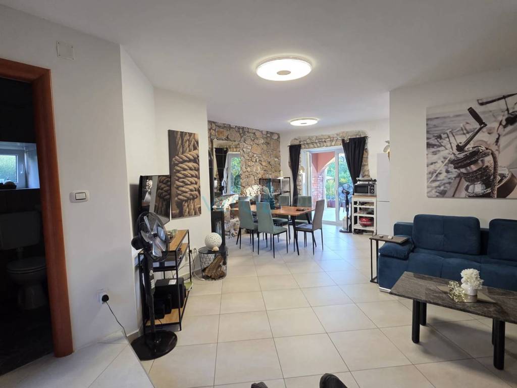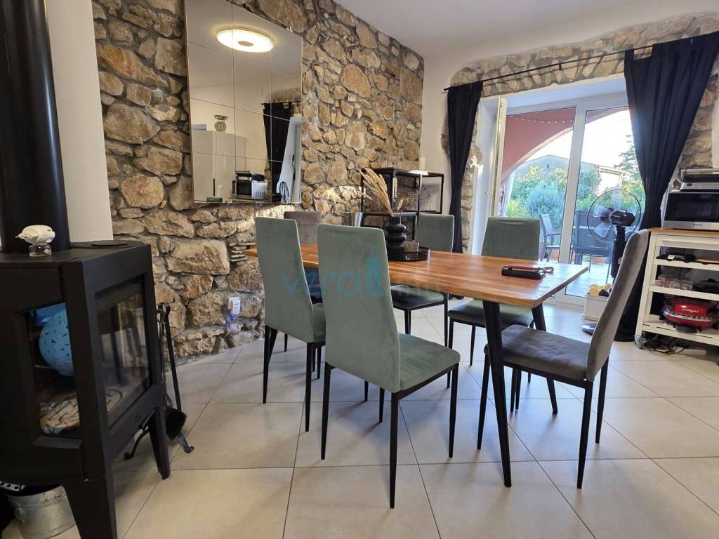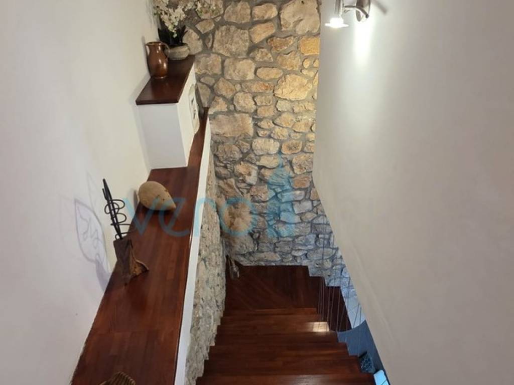 Island of Krk, Dobrinj, surroundings, stone house with a swimming pool, living area of 140 m2 with a yard of 355 m2. This detached house also holds the status of a cultural monument from the early 20th century, which is why the 2009 extension preserved antique features such as the stone facade on the east side of the house and stone details in the interior. The house was completely renovated in 2020, with attention to detail and is excellently maintained. In the fenced yard, arranged with flowers and Mediterranean herbs, there is a pool with a sunbathing area, a barbecue with storage, a covered terrace, and parking space for two cars with access to the house. On the ground floor of the house, there is a bathroom with a shower, a kitchen with a dining area and living room with access to the terrace, and a staircase leading to the upper floor. There are two bedrooms, a spacious bathroom with a bathtub, and a balcony with a view of the surroundings. Heating and cooling are provided by air conditioning units and a wood-burning fireplace, and all furniture and equipment are included in the price. The house is located 4200 m from the sea in a cul-de-sac of a settlement near Dobrinj, surrounded by forest and family houses, making it an ideal property for vacation.