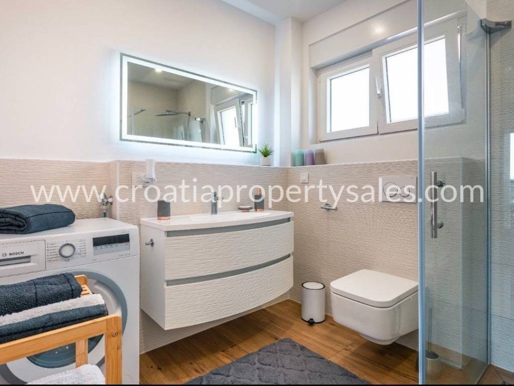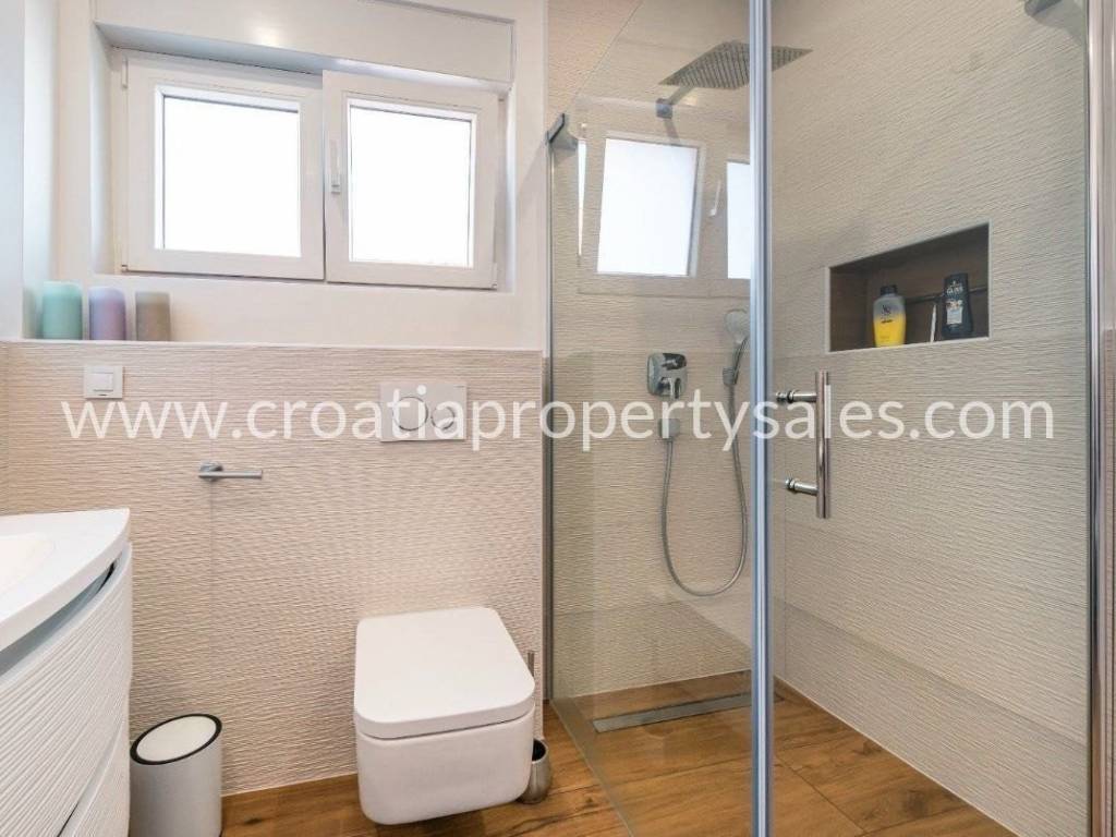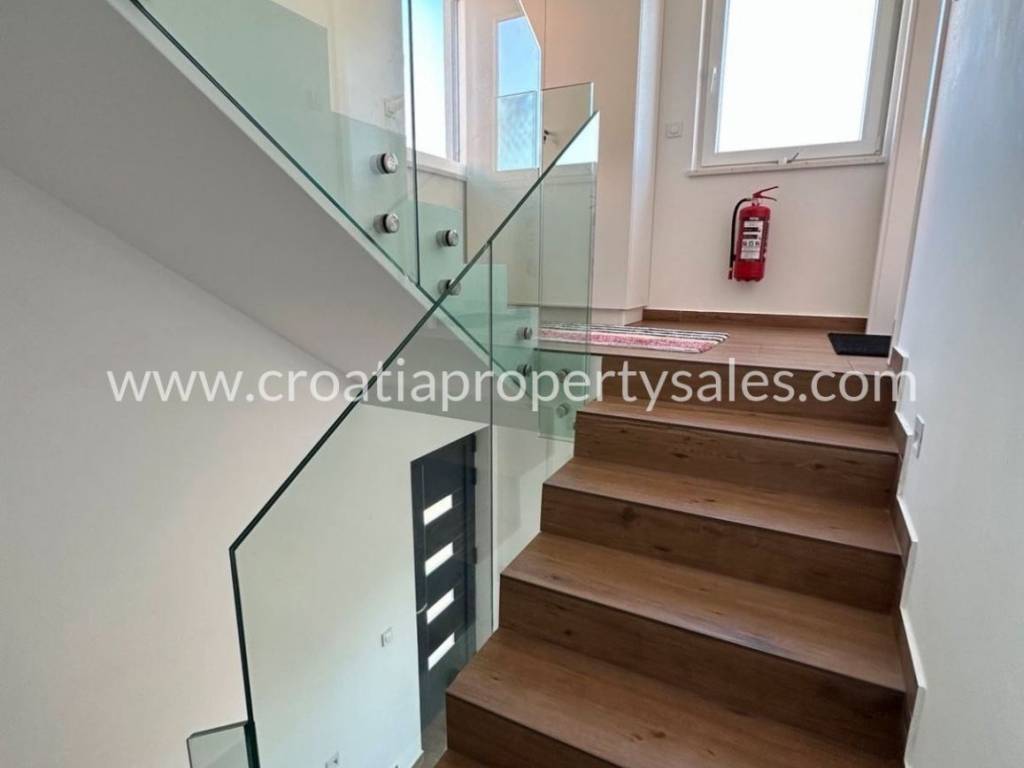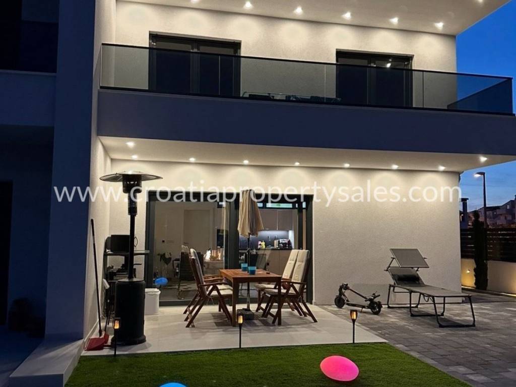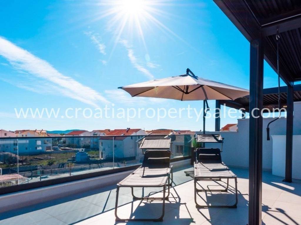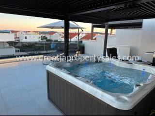 In a town not far from Sibenik is this semi-detached villa type house with a roof terrace spread over 3 floors. The ground floor of 48 m2 consists of an entrance area, kitchen/ dining area, and wc. On the 1st floor of 39 m2 is a hallway, living room, bedroom, bathroom and covered terrace of 13 m2.On the second floor there is a summer kitchen and a roof terrace of 46m2 with a jacuzzi, barbecue, and a relaxation area.On the ground floor there is a covered terrace of 12m2 with an additional space for dining in the summer and a garden of 160.05m2.The house is built of the highest quality materials according to the highest construction standards.The house is being sold fully furnished, and it comes with three parking spaces.
