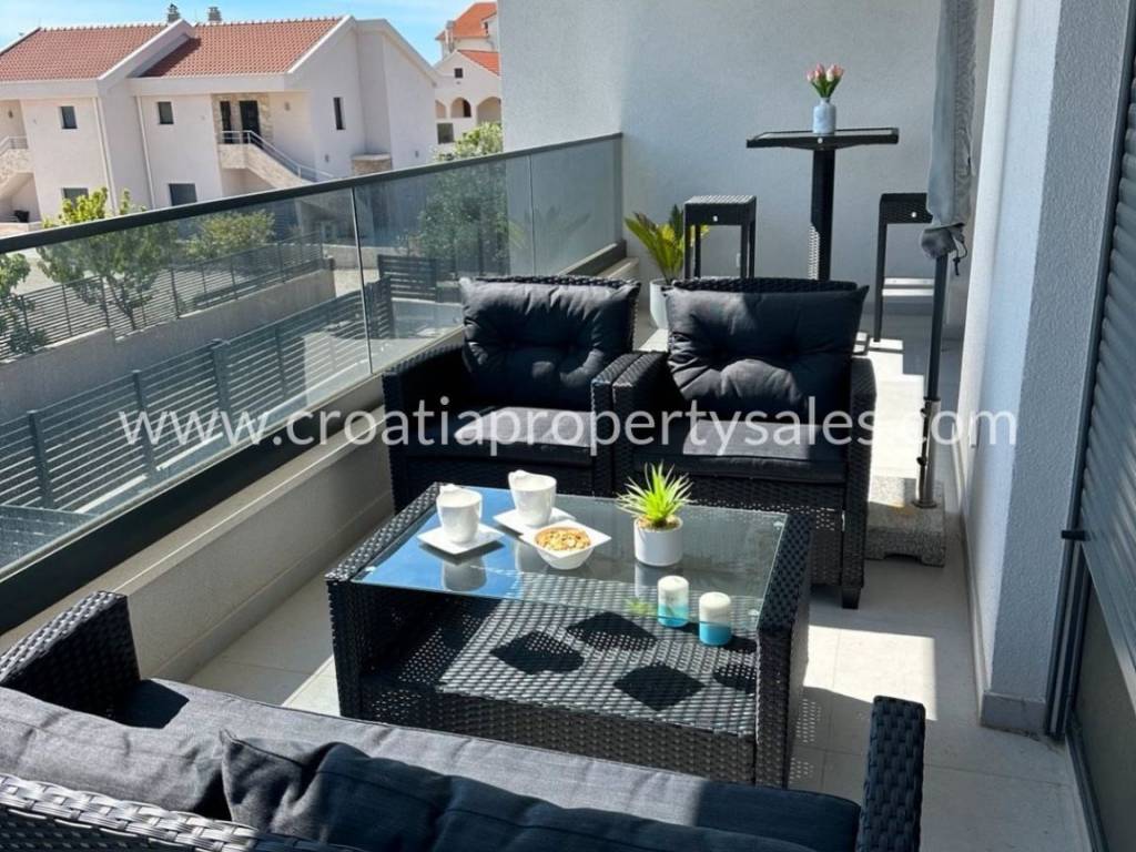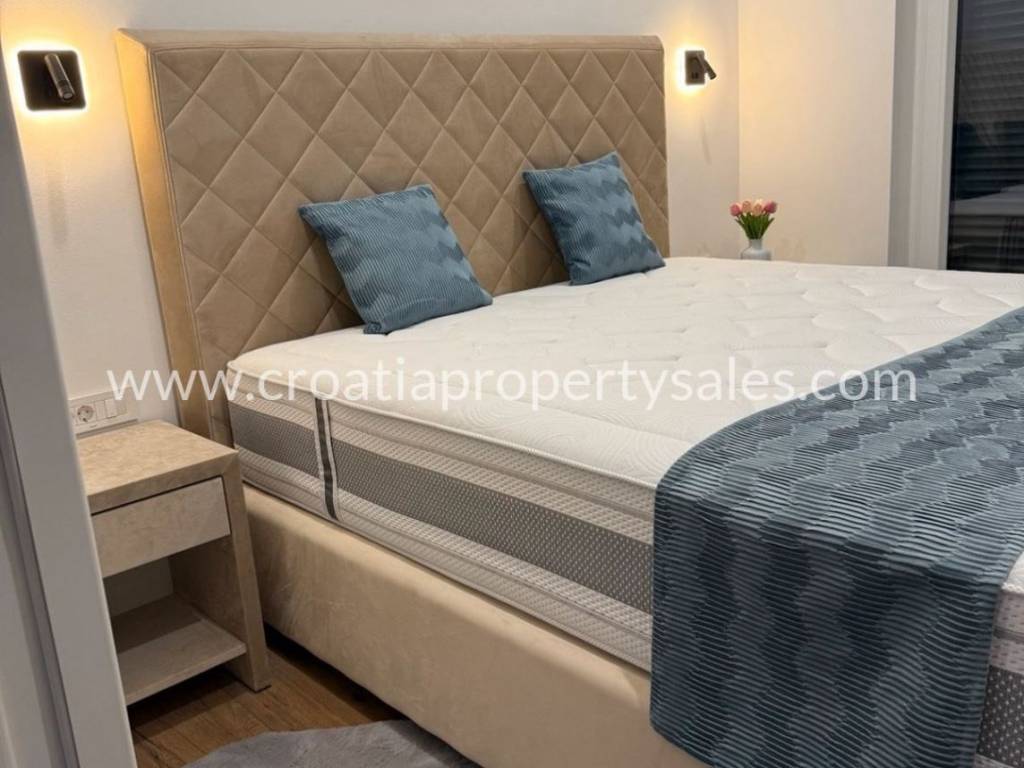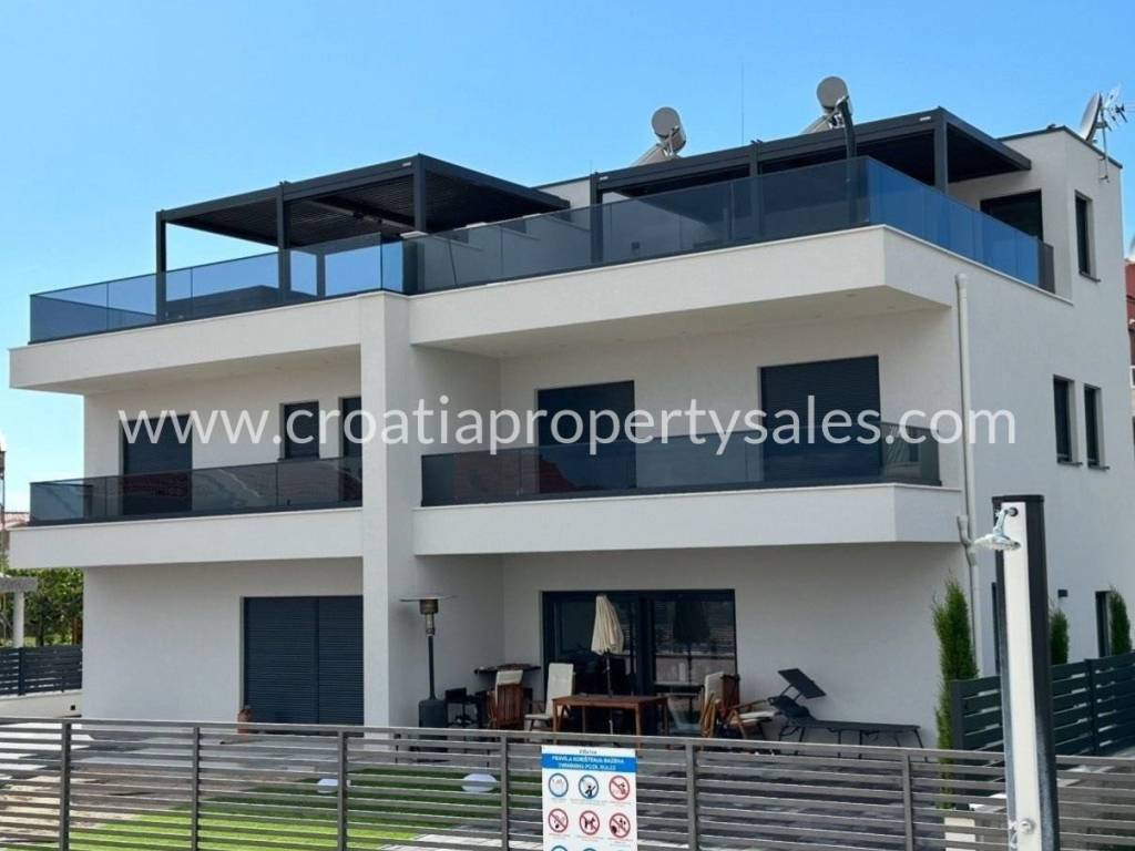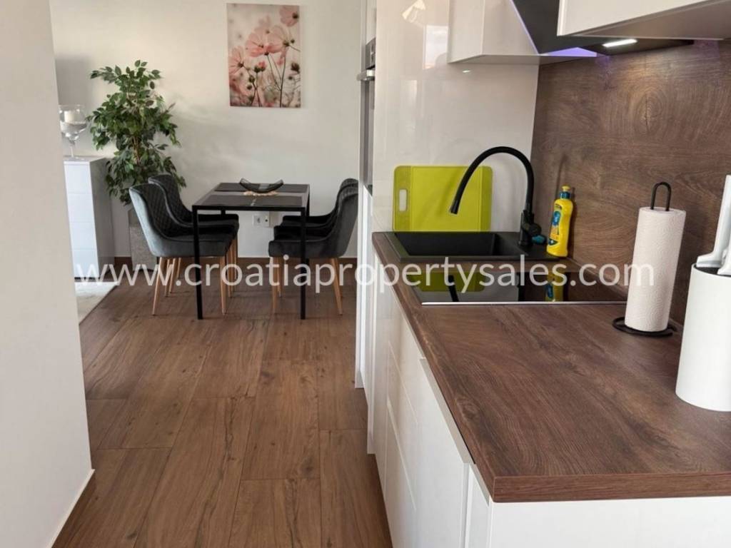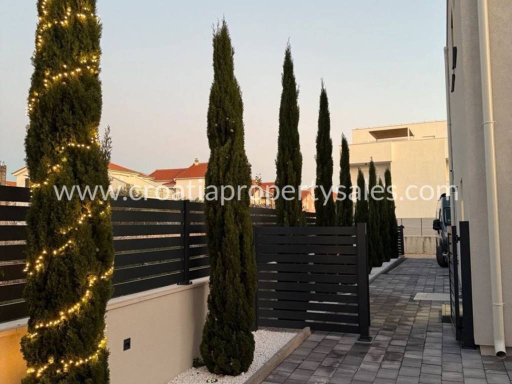 In a town not far from Sibenik is this semi-detached villa type house with a roof terrace spread over 3 floors. The ground floor of 48 m2 consists of an entrance area, kitchen/ dining area, and wc. On the 1st floor of 39 m2 is a hallway, living room, bedroom, bathroom and covered terrace of 13 m2.On the second floor there is a summer kitchen and a roof terrace of 46m2 with a jacuzzi, barbecue, and a relaxation area.On the ground floor there is a covered terrace of 12m2 with an additional space for dining in the summer and a garden of 160.05m2.The house is built of the highest quality materials according to the highest construction standards.The house is being sold fully furnished, and it comes with three parking spaces.