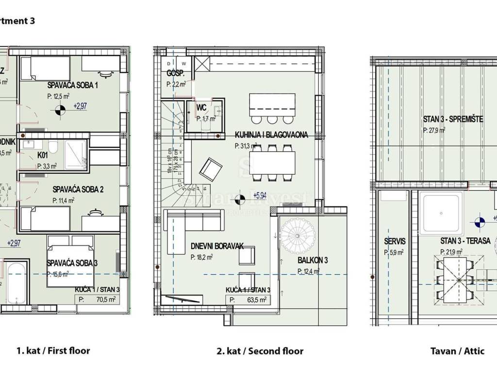 OPATIJA, for sale is a comfortable three-story apartment, 3 bedrooms + living room, with a luxurious roof terrace and an amazing view of the sea! This modern new building with only 3 apartments offers a perfect combination of comfort and quality, and is located in an excellent location, which provides you with everything you need for a comfortable life or vacation. It is only a 15-minute walk or a few minutes' drive away from beautiful beaches and the sea, the center of Opatija is only a 5-minute drive away, while the center of Rijeka is only a ten-minute drive away. Apartment 3 with a total area of 180,7 m2 is located on the first and second floor and in the attic, and offers a lot of space for a comfortable life. On the first floor there is an entrance and corridor with staircase, master bedroom with en-suite bathroom, two more bedrooms with a shared bathroom. On the second floor, there is a storage room, toilet, spacious living room with kitchen and dining area with access to a balcony of 12,4 m2 with a view of the sea. From the balcony the staircase leads to the attic where is a storage room, service room and a luxurious roof terrace of 21.9 m2 - an ideal place to enjoy the spectacular view of the entire Kvarner Bay and relax with a cup of coffee in the morning or evening. The apartment has 2 parking space. The apartments are designed with special attention to quality and are superbly equipped: • aluminum exterior joinery that ensures excellent insulation • heating/cooling on a heat pump for your comfort throughout the year • anti-burglary entrance door • high-quality materials and finishing works This apartment offers the perfect balance of comfort, beautiful sea view and great location, making it ideal for living or investment. PRICE The stated price refers to a completely finished apartment on a turnkey basis, without furniture. The price includes 25% VAT, the buyer doesn’t pay the real estate transfer tax. In case of buying on a legal entity registered in Croatia it is possible to refund full VAT after the purchase. For more information and a viewing appointment call: +385/99/320-0008 ID CODE: 14355 Ante Demo Agent s licencom Mob: +385/91/4201344 E-mail: ante@smart-invest.hr www.smart-invest.hr