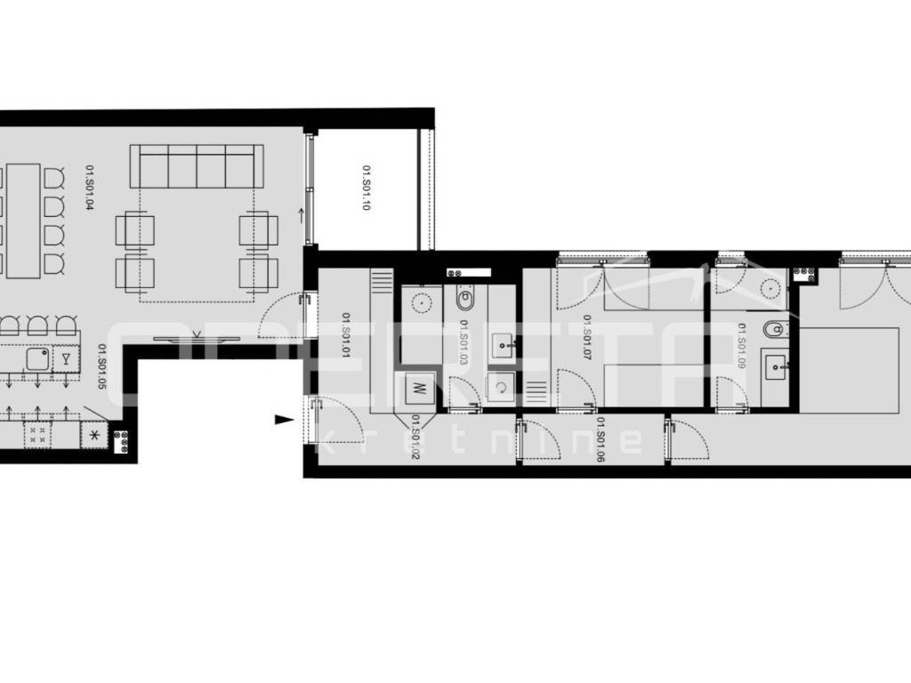 S01 - trosoban stan na prvom katu, zatvorene površine 97,12m2, sa loggiom 5,41m2 (4,06). Ukupno NKP 101,18m2.