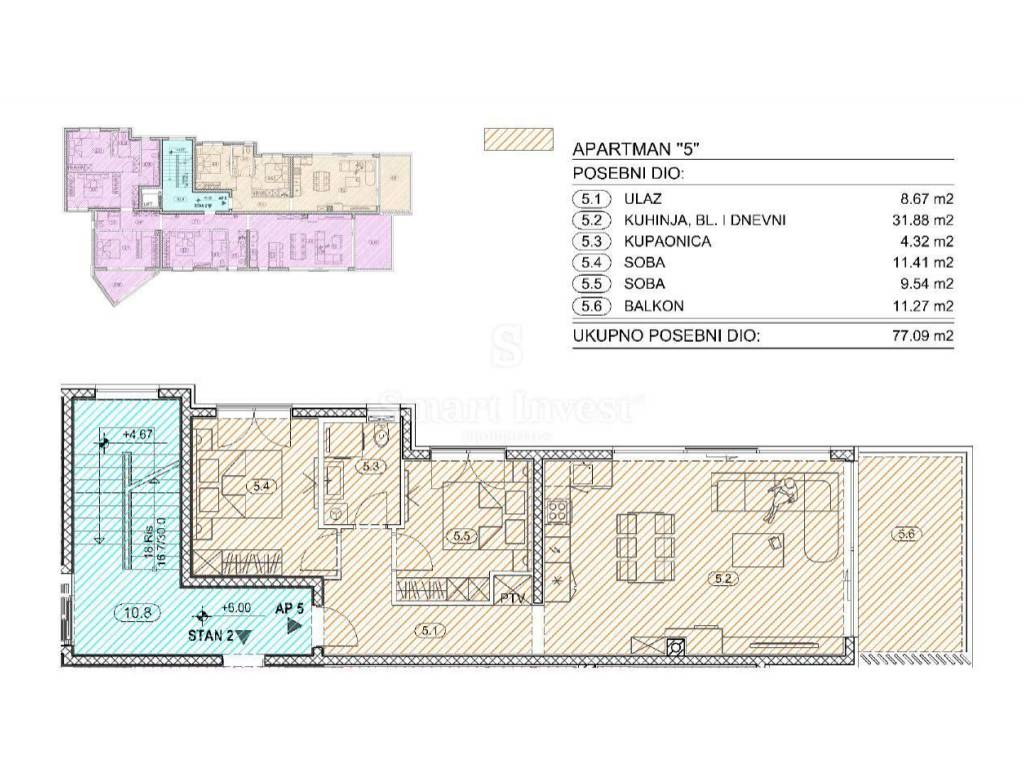 OPATIJA, For sale is a comfortable apartment, 2 bedrooms + living room, with a sea view, in a top-quality new building with a garage and an elevator near the center of Opatija. APARTMENT 5, with a total usable area of ​​101.56 m2, is located on the 2nd floor and consists of an entrance hall, living room with kitchen and dining room, two bedrooms, bathroom and covered balcony (total usable area of ​​77.09 m2) and 1 garage parking space of 11.97 m2 and 1 outdoor parking space of 12.50 m2. The highest quality materials are used in the construction and all apartments will be modernly furnished. Beautiful and quiet location near the center of Opatija and the sea. For more information and a viewing appointment, call: +385/99/320-0008 ID CODE: 14108 Agencija Opatija Ovlašteni posrednik Mob: +385/99/320-0008 E-mail: office@smart-invest.hr www.smart-invest.hr Marin Baričević Agent s licencom Mob: +385(0)99/320-0009 E-mail: marin@smart-invest.hr www.smart-invest.hr