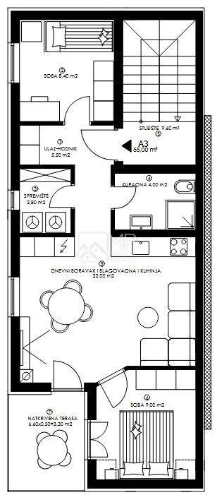 APARTMENT ON THE 2ND FLOOR MARKED "A3" (55 m2) includes: entrance hall, living room + kitchen + dining room with access to a covered terrace, two bedrooms, storage room and bathroom.