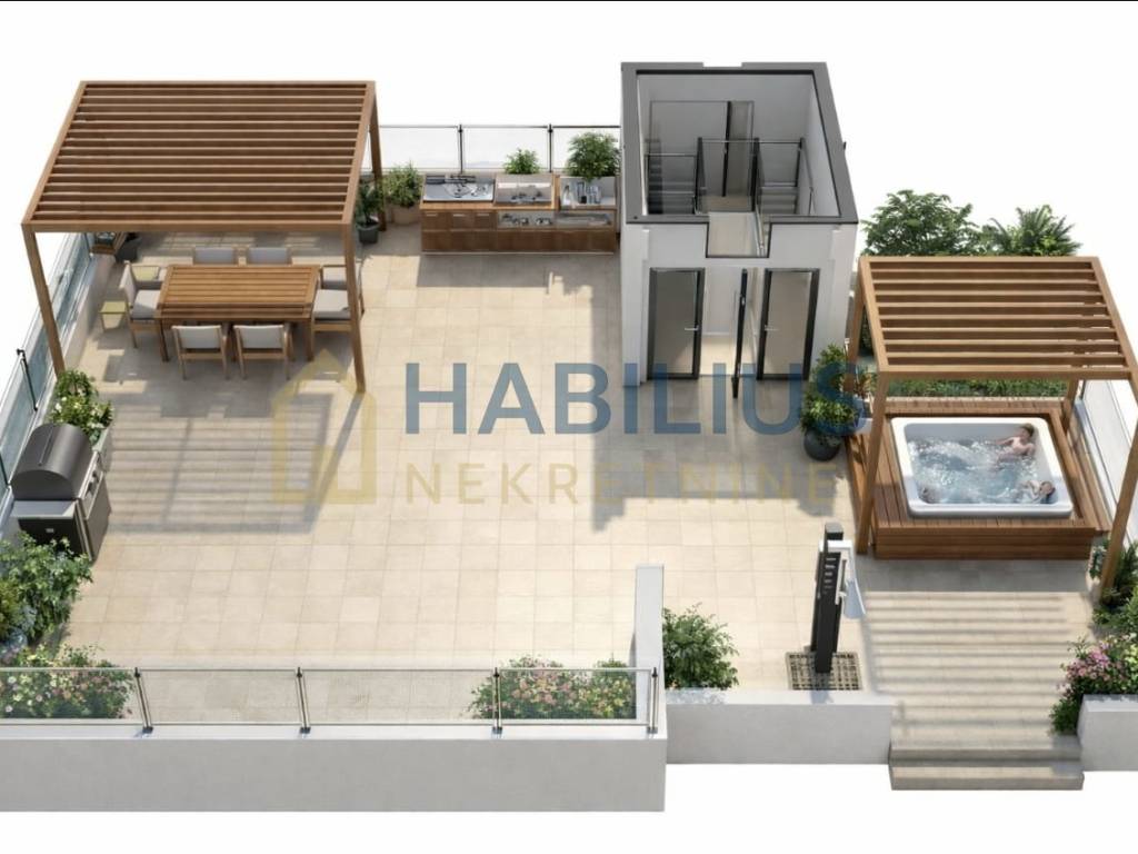 Unutrašnjost ovog stana odlikuje se odlično osmišljenim rasporedom prostorija koji se može koristiti kao jedan veliki četverosobni, ili kao dva odvojena stana. Stanu pripada veliki južni balkon od 18 m2, kao i lođa od 14 m2 na istoku. Ujedno stanu pripada prohodna terasa iznad stana od 122 m2 s koje se pruža predivan pogled na more. U slučaju korištenja stana kao dva manja, oba bi imala svoj vlastiti balkon (lođu). Stanu također pripadaju i dva parkirna mjesta. Odlična prilika za kvalitetan i miran život.