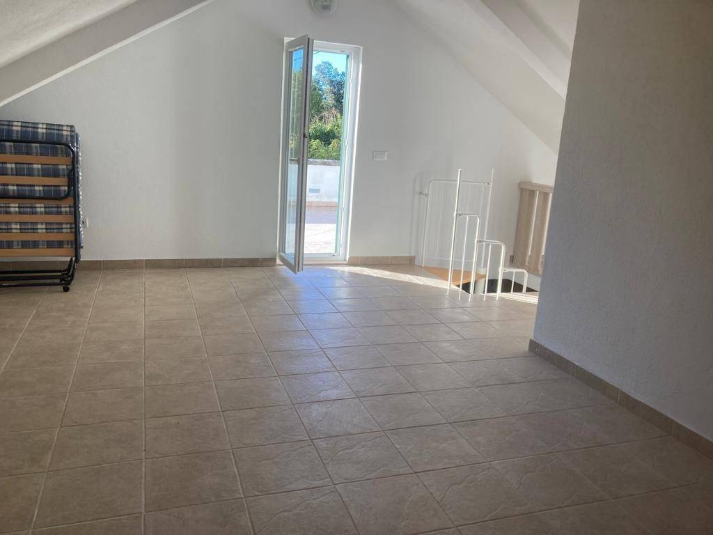 The ground floor (104 m²) consists of a spacious living room connected to the kitchen, a bathroom, and three bedrooms. The upper floor offers 70 m² of finished open space with a bathroom, which can easily be divided according to the new owner’s needs.