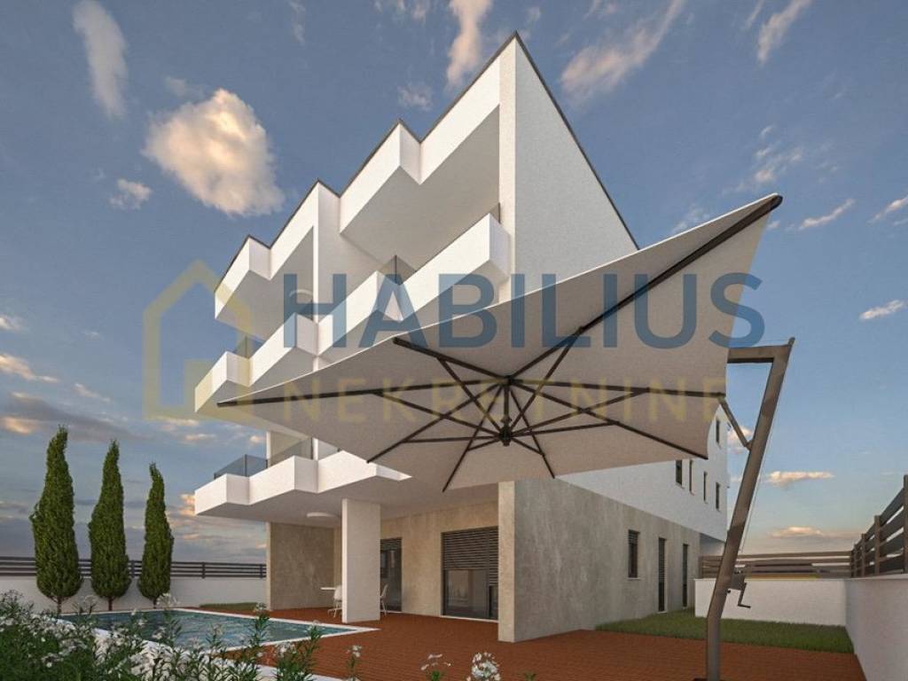 Lux trosobni stan s lođom i terasom cca 100m2, u prizemlju manje stambene zgrade s otvorenim pogledom na more, prozračan i pun svjetla, orijentacije i-j-z. Sastoji se od 3 spavaće sobe, kuhinje+blagovaonice+dnevnog boravka otvorenog koncepta, hodnika, 2 kupatila s podnim grijanjem, velike terase s pogledom na more, još jedne natkrivene terase od 30m2 na sjeveru, bazena i velikog vrta. Za stanovanje ili turizam. Ima pripadajuća 2 park.mjesta (1 garažno, 1 vanjsko). U blizini trgovina, bus, restorani i sl.