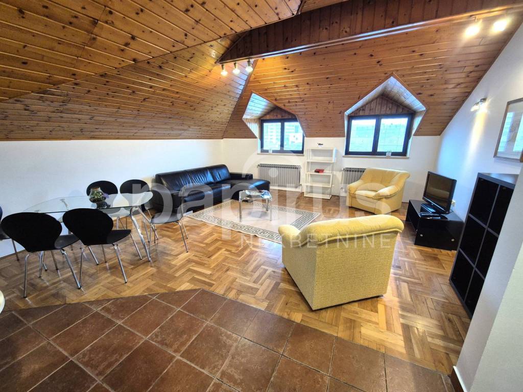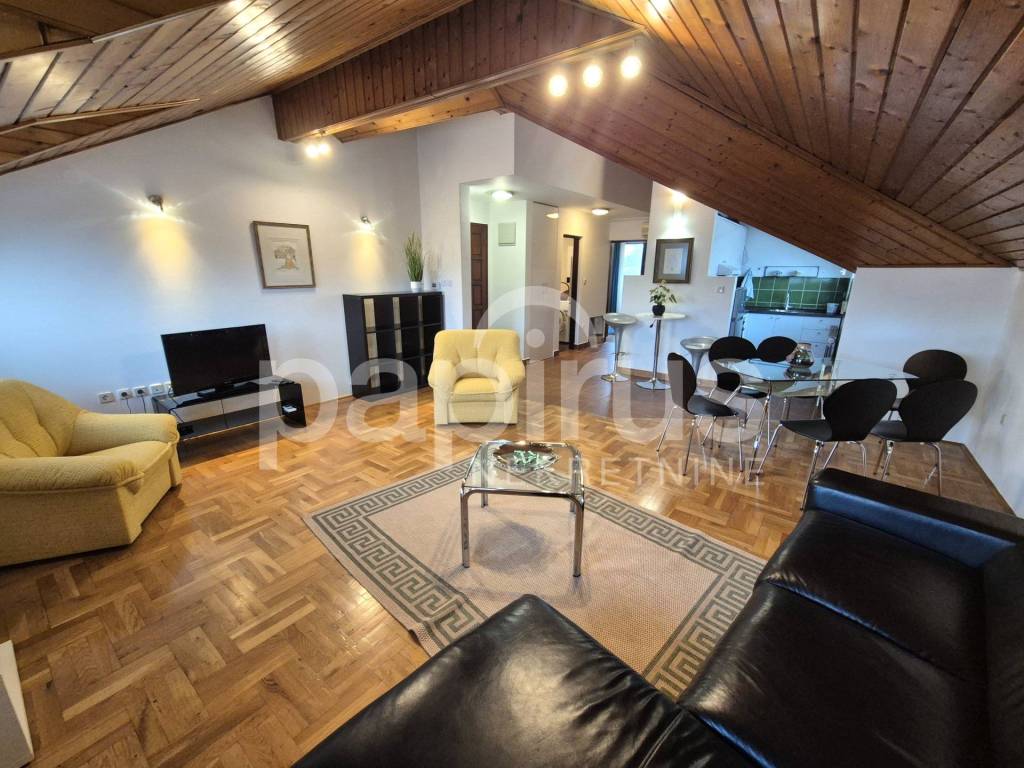 Stan na III katu (potkrovlje), u stambenoj zgradi, sagrađenoj 1995.godine. Površina stana iznosi 75 m2 i sastoji se od ulaznog hodnika, dnevnog boravka s blagovaonicom i kuhinjom, kupaonice s WC-om i dvije spavaće sobe od kojih jedna ima izlaz na balkon. Stan je namješten i opremljen kvalitetnim i funkcionalnim namještajem i svom potrebnom tehnikom. Telefonski i/ili internetski priključak po potrebi. Mogućnost kabelske televizije. Klima uređaj. Perilica posuđa. Perilica rublja.