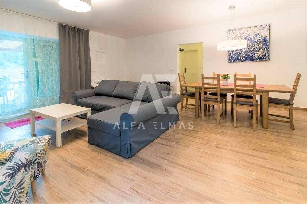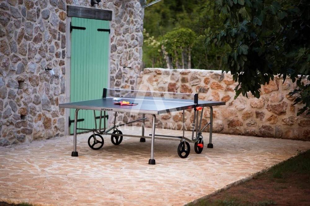 Vrbnik, a detached, adapted stone house with a living area of 90m2 with a swimming pool and a beautiful spacious garden of 3000m2, completely renovated in 2018. The one-story stone house consists of an entrance area, a living room, a dining room and a kitchen united in one comfortable space, from which there is an exit to the outdoor covered terrace and garden where there is a swimming pool with a waterfall and a sunbathing area. The stone house has two bedrooms, two bathrooms and a toilet. The equipment of the house near Vrbnik includes wooden carpentry, high-quality sanitary ware, top-quality equipment in the bathrooms, satellite TV, a swimming pool paved with glass ceramic mosaic tiles, pool equipment and lighting. There are four parking spaces on the spacious landscaped garden. The stone house is very attractive for tourism, it is located on the edge of the green zone near Vrbnik, in complete silence with a wonderful view of the green belt, only 700m from the sea.