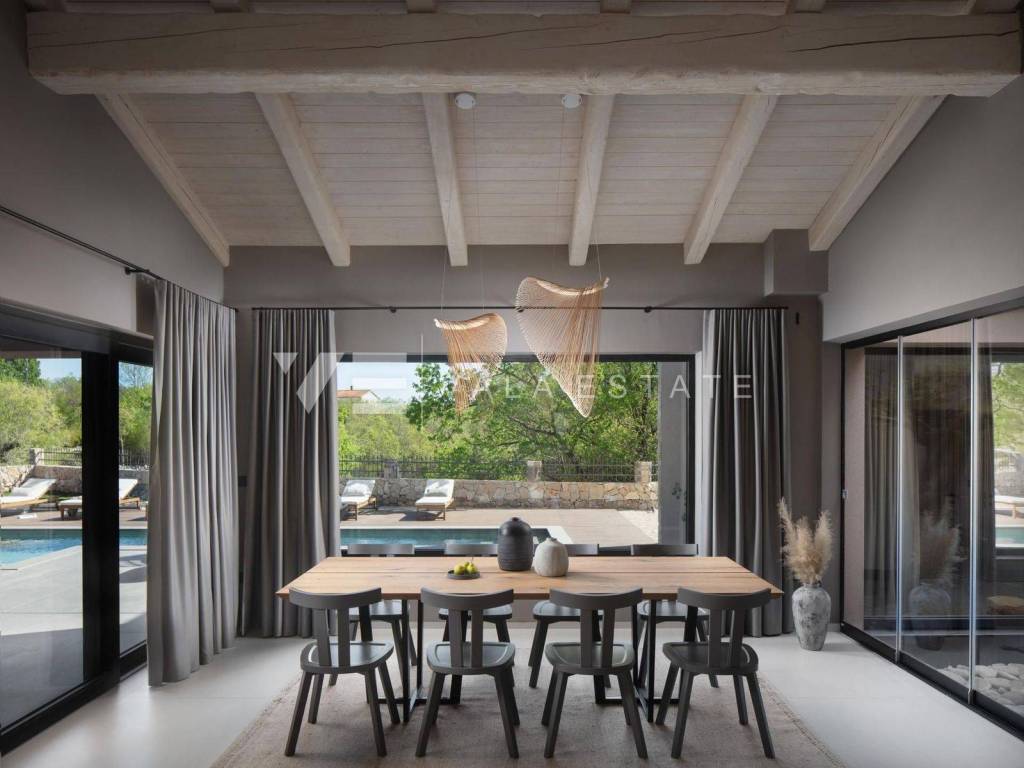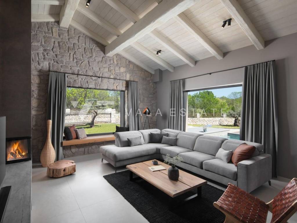 Real estate on the island of Krk, Vrbnik surroundings - a new modern villa with elegant lines is for sale in a beautiful and quiet location with an excellent layout, swimming pool and luxury designer furniture. The villa occupies a total of 220 m2 and is divided into a ground floor and a first floor. The ground floor includes an open living area with a kitchen and dining room with lots of natural light and access to a covered terrace and garden, a toilet and a bedroom with its own bathroom. On the floor, which is connected by an internal staircase, there are two more spacious bedrooms with their own bathrooms and a sauna. The villa is fully finished and furnished, and exceptional quality materials were used, top-quality ceramics and modern sanitary ware, ALU and PVC joinery, all rooms are air-conditioned, underfloor heating throughout the house and many other features. The yard is decorated and enriched with Mediterranean horticulture, and it is completed by a 47 m2 swimming pool, a pergola, a sundeck, a summer kitchen and a beautiful sitting area with a fireplace for evening gatherings. The location is very pleasant and quiet, 4000 m from the sea. Agency Vala Estate Malinska will provide you with a safe and transparent transfer of ownership and all necessary documentation. ID CODE: k-489 VALA ESTATE d.o.o. Mob: +385 99 444 0550 Tel: +385 51 568 917 E-mail: info@vala-estate.com www.vala-estate.com