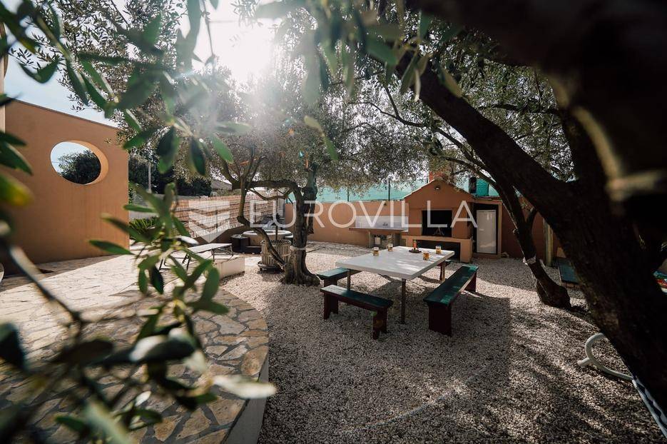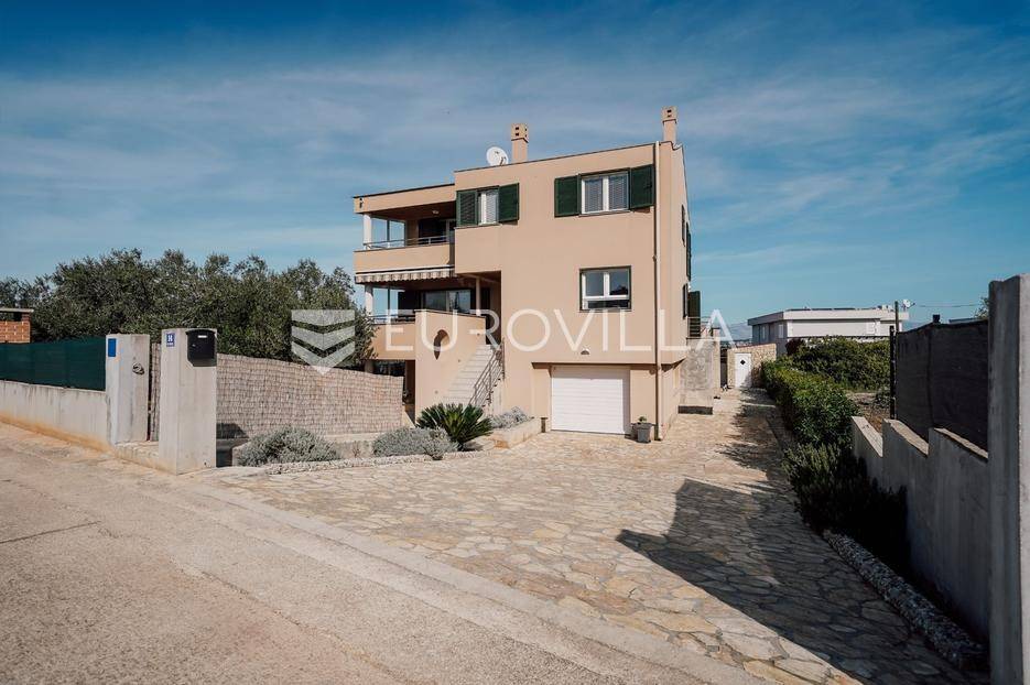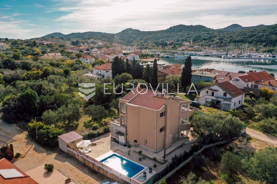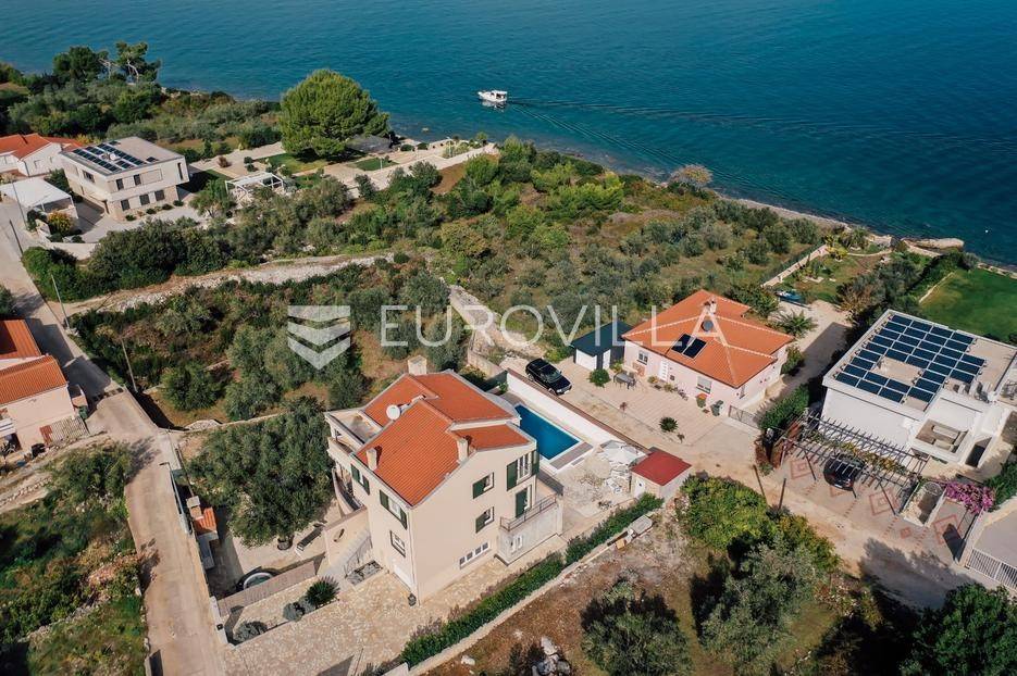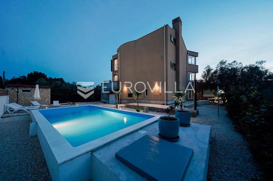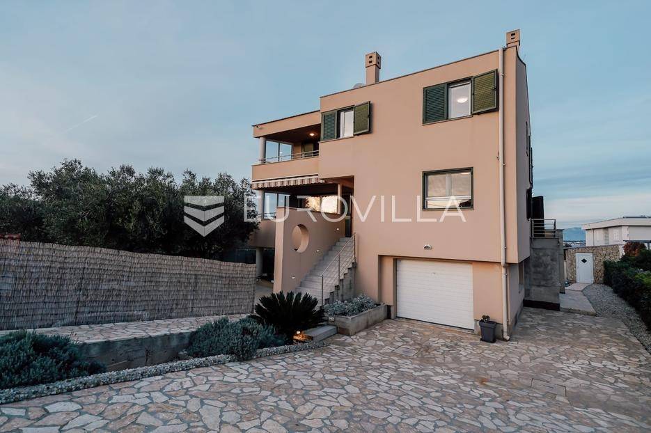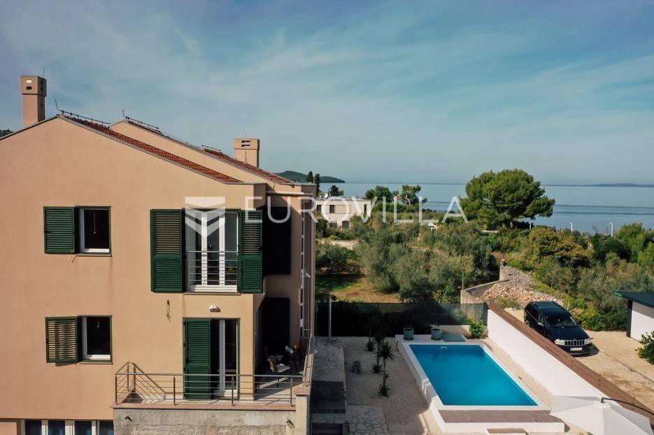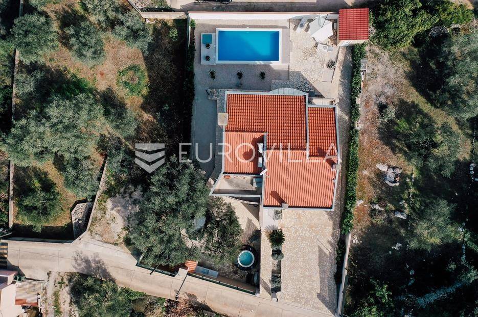 Sutomišćica, lijepa samostojeća kuća nalazi se na zemljištu površine 610 m2.Proteže se na tri etaže, a sastoji se od 235 m2 stambenog prostora.U prizemlju kuće površine 84 m2 nalazi se garaža, vešeraj, spremište, gostinjski wc, terasa i ljetna kuhinja.Na drugoj etaži nalazi kuhinja i blagovaonica prostrani dnevni boravak, kupaonica te terase, dok se na posljednjoj etaži nalaze četiri spavaće sobe te kupaonica.U dvorištu uređenom u mediteranskom stilu nalazi se bazen.S terasa se pruža pogled na more te na grad Zadar.Kuća je potpuno namještena i opremljena.Sustav grijanja i hlađenja uređen je putem klima uređaja, uz mogućnost grijanja na drva.Postoji priprema i projekt za solarnu elektranu.Uredno vlasništvo.Više informacija na upit.