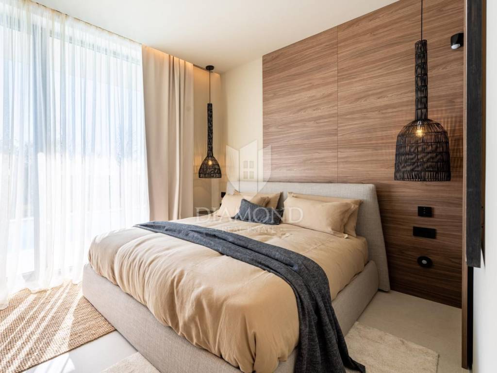 In an attractive location, in a newly built settlement with complete infrastructure, this modern single-storey house with a living area of 234m² on a plot of 783m² is located. The location in the first row of the settlement, next to olive groves and greenery, guarantees peace, privacy and an open view of the sea in the distance. The house was designed with an emphasis on comfort, aesthetics and top functionality. All spaces are located on one floor, which ensures a pleasant and practical stay. The interior consists of an elegant entrance hall, four luxurious bedrooms with private bathrooms, a guest toilet, a utility room and a spacious open-space area: living room, kitchen with island and dining room. An impressive full-height glass wall opens towards the sundeck and heated pool, connecting the indoor and outdoor spaces into one harmonious whole. The interior is fully equipped with designer furniture from renowned brands, while triple-layered glass, aluminum joinery, suspended ceilings and quality ceramic floor coverings emphasize the level of performance. Heating and cooling are provided by underfloor heating with a heat pump and air conditioning. The entire villa is equipped with a Smart Home system, optics for fast internet, video surveillance and an alarm, and the energy certificate A guarantees low consumption and high efficiency. The landscaped yard brings everything you need for relaxation and enjoyment: a heated swimming pool with inverter technology, a sundeck with deck chairs, a summer kitchen with a barbecue, an outdoor shower and a lounge area. Automated irrigation, a robotic lawnmower and a pool filtration system simplify maintenance. Two covered parking spaces are also available, while preparations for a solar power plant and a sauna have been made.