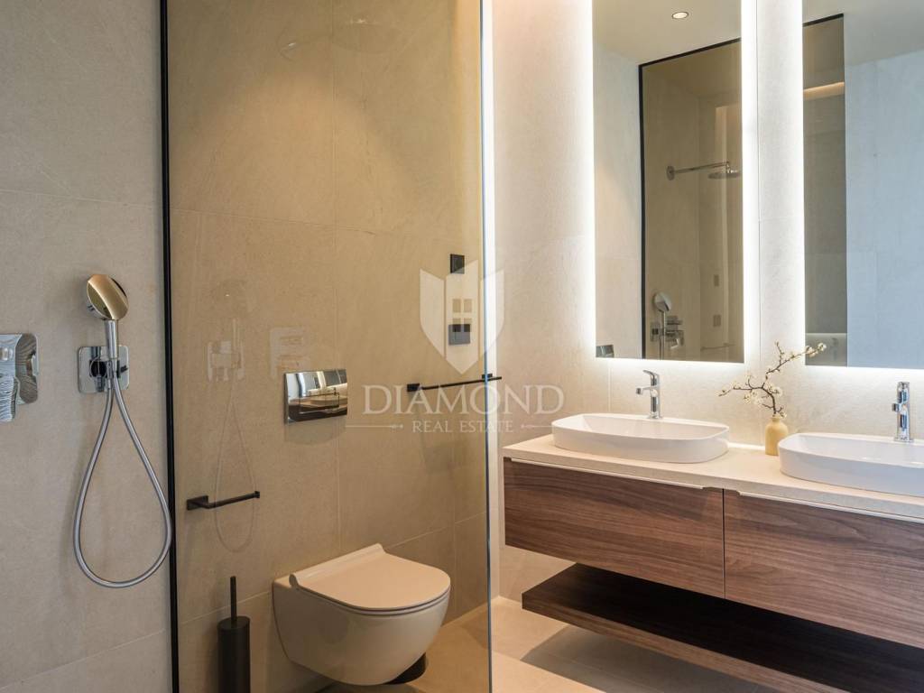 In an attractive location, in a newly built settlement with complete infrastructure, this modern single-storey house with a living area of 258m² on a plot of 1005m² is located. The location in the first row of the settlement, next to olive groves and greenery, guarantees peace, privacy and an open view of the sea in the distance. The house was designed with an emphasis on comfort, aesthetics and top functionality. All spaces are located on one floor, which ensures a pleasant and practical stay. The interior consists of an elegant entrance hall, four luxurious bedrooms with private bathrooms, a guest toilet, a utility room and a spacious open-space area: living room, kitchen with island and dining room. An impressive full-height glass wall opens towards the sundeck and heated pool, connecting the indoor and outdoor spaces into one harmonious whole. The interior is fully equipped with designer furniture from renowned brands, while triple-layered glass, aluminum joinery, suspended ceilings and quality ceramic floor coverings emphasize the level of performance. Heating and cooling are provided by underfloor heating with a heat pump and air conditioning. The entire villa is equipped with a Smart Home system, optics for fast internet, video surveillance and an alarm, and the energy certificate A guarantees low consumption and high efficiency. The landscaped yard brings everything you need for relaxation and enjoyment: a heated swimming pool with inverter technology, a sundeck with deck chairs, a summer kitchen with a barbecue, an outdoor shower and a lounge area. Automated irrigation, a robotic lawnmower and a pool filtration system simplify maintenance. Two covered parking spaces are also available, while preparations for a solar power plant and a sauna have been made.