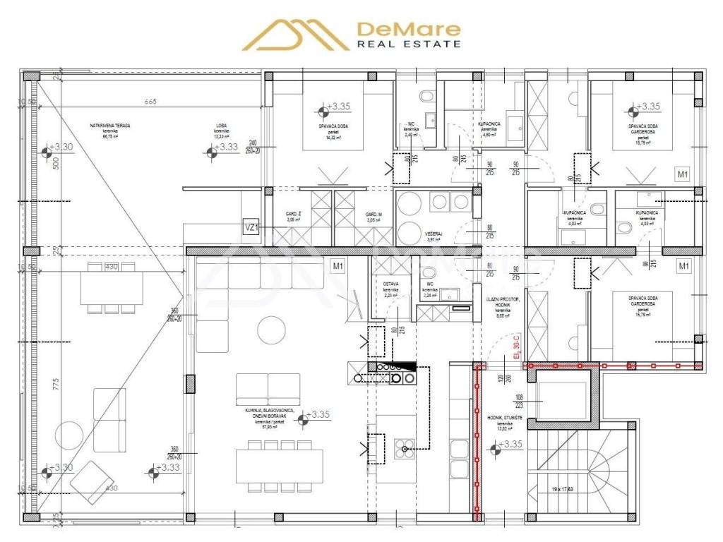 The apartment also includes one outdoor parking space (13.75 m2), two garage parking spaces (36.24 m2) and a storage room (9.92 m2) in the basement of the building.