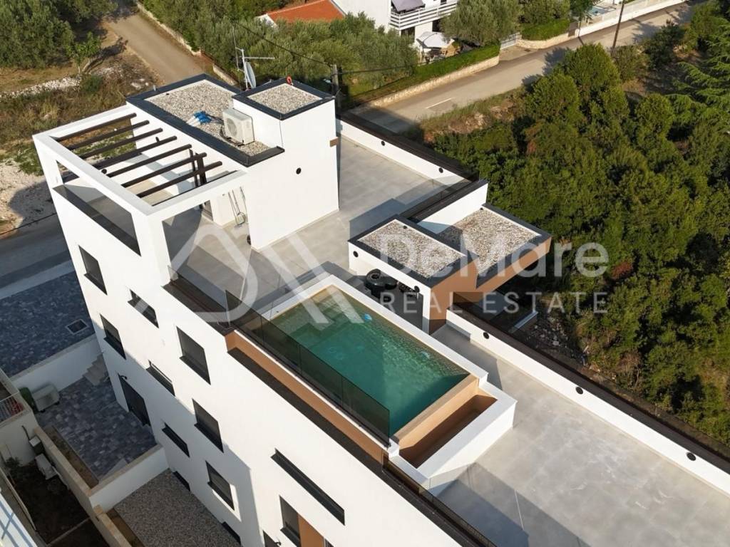 A luxurious NEWLY BUILT apartment is for sale in an exceptional location - third row to the sea, only 100 meters from the sea and the beach. This luxurious building right on the sea has a total of 4 residential units, and consists of a basement, ground floor, first and second floors, and a spacious roof terrace with a beautiful panoramic view of the sea and islands. All floors are connected by an elevator.