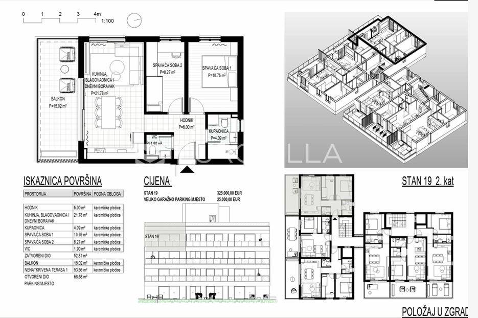 U popularnom odmaralištu srednje Dalmacije, Okrugu Gornjem na Čiovu gradi se stambeni objekta s 24 apartmana na pješačkoj udaljenosti od plaže od 370 m.Objekt se gradi na 5 etaža (jedna podzemna etaža i četiri nadzemne etaže ) uz iskoristivu krovnu terasu koja pripada stanovima na zadnjem katu. Objekt će imati lift.Apartman S19 na trećem katu (u projektu označen kao drugi kat) orijentacije jug se sastoji od ulaznog prostora površine 6 m2, dnevnog prostora površine 21 m2 (kuhinja, blagovaonica i dnevni boravak), dvije spavaće sobe površina 10 m2 odnosno 8 m2, kupaonice površine 4 m2, toaleta površine 2 m2, natkrivene terase površine 15 m2 i nenatkrivene krovne terase površine 53 m2.Svi apartmani će biti opremljeni podnim grijanjem i klima uređajima u dnevnom prostoru i jednoj spavaćoj sobi a podne obloge će biti od keramičkih pločica prve klase. Prozori će biti od PVC-a s komaricama i roletama na struju a vanjska fasadna izolacija će biti od stiropora debljine 10 cm.U fazi izgradnje još je moguće dogovarati uređenje interijera.Apartmanu S19 pripada veliko garažno parking mjesto po cijeni od 25.000 eura.Očekivani početak radova je ljeto 2026 godine a useljenje početak 2028 godine. Trenutačno se primaju rezervacije a nakon početka radova potpisuje se predugovor.Način plaćanja: rezervacija min 5.000 eura / 30 % prilikom potpisa predugovora / 30 % nakon završetka konstrukcijskih radova / 15 % nakon završetka fasade / 15 % nakon završetka unutrašnjosti / 10 % nakon ishođenja uporabne dozvole.Kako je otok Čiovo svojevrstan produžetak grada Trogira, nudi pregršt mogućnosti za odmor, rekreaciju i kupanje te razgledavanje mnogobrojnih povijesnih spomenika.