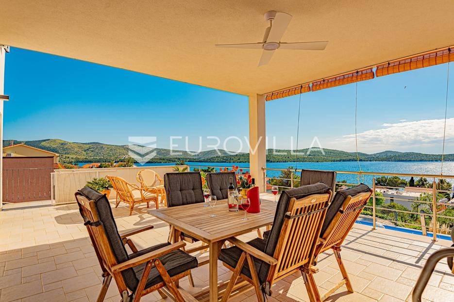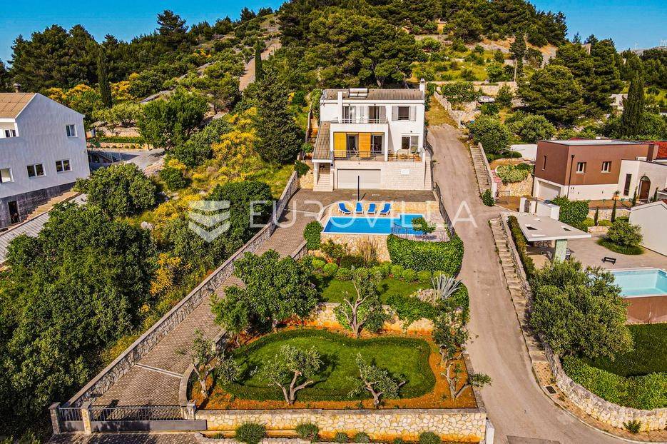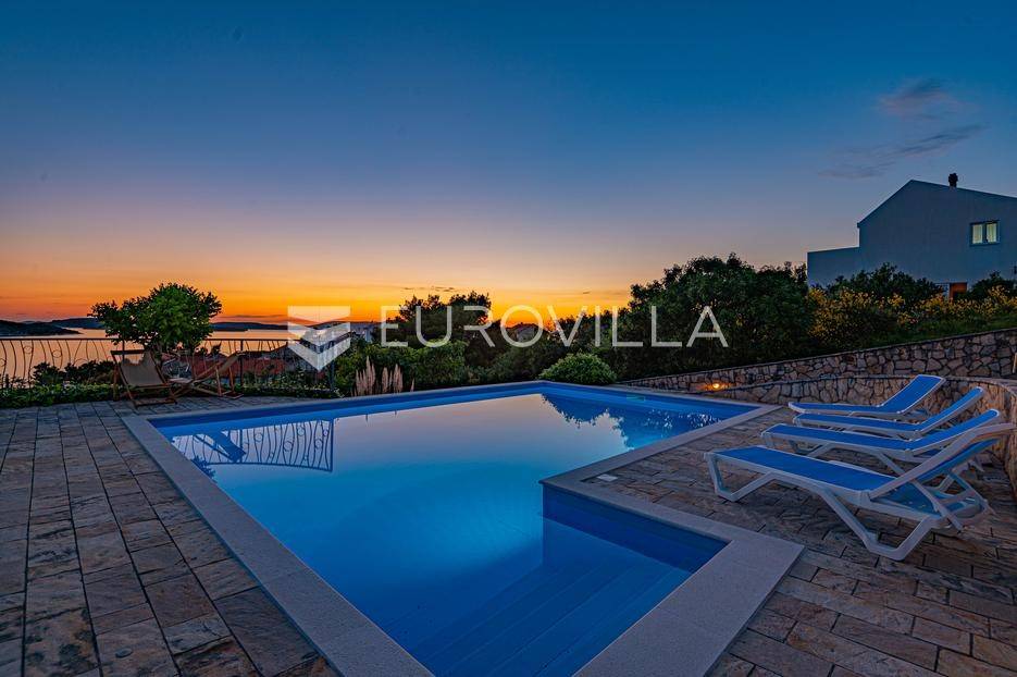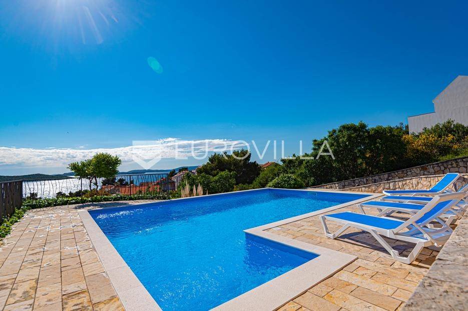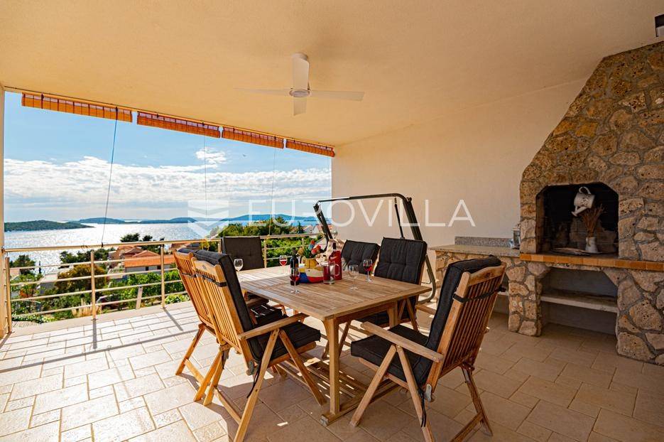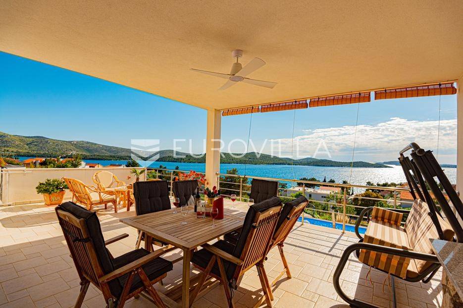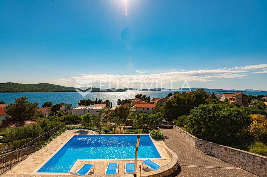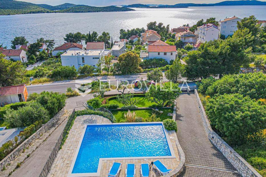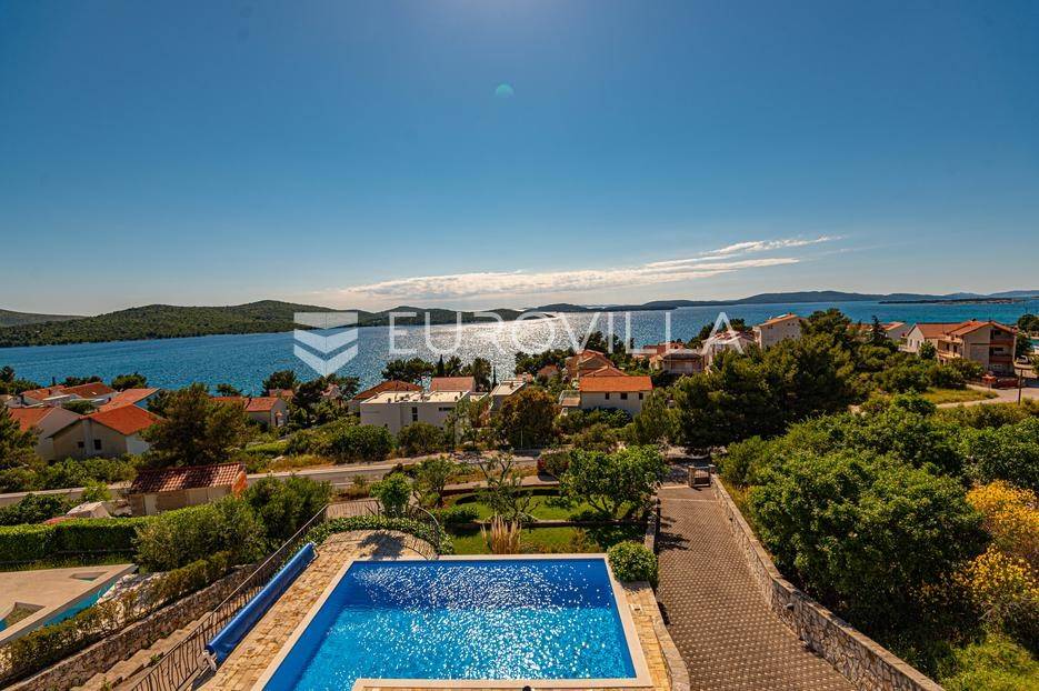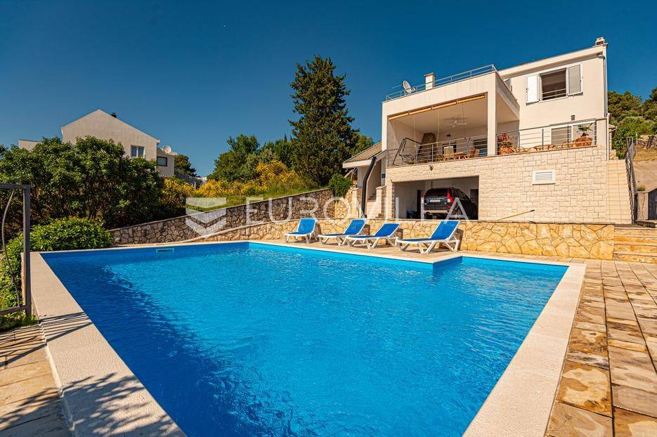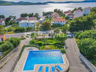 Šibenik, Žaborić, prekrasna kuća s bazenom i panoramskim pogledom na more, ukupne površine 438 m² izgrađena 2004. godine. Prodaje se potpuno namještena i opremljena, te idealna za odmor ili turistički najam.Izgrađena na parceli od 1215 m²., sastoji se od podruma u kojem je smještena garaža za dva automobile, strojarnica, konoba, te dva spremišta. U prizemlju se nalazi prostrani dnevni boravak s kuhinjom i blagovaonicom, spremište, vešeraj i toalet. Iz boravka se izlazi na veliku natkrivenu terasu s pogledom na more, na kojoj se nalazi komin i prostor za druženje. Na katu su smještene tri spavaće sobe od kojih svaka ima privatnu kupaonicu, a dvije sobe imaju i izlaz na terasu s pogledom na more.Kuća je građena po vrhunskim standardima, te je jako lijepo uređena. Okružena je jako lijepim vrtom koji je odlično uređen i održavan, te se u njemu nalazi i veliki bazen i prostor za sunčanje.Sve ostale informacije na upit.