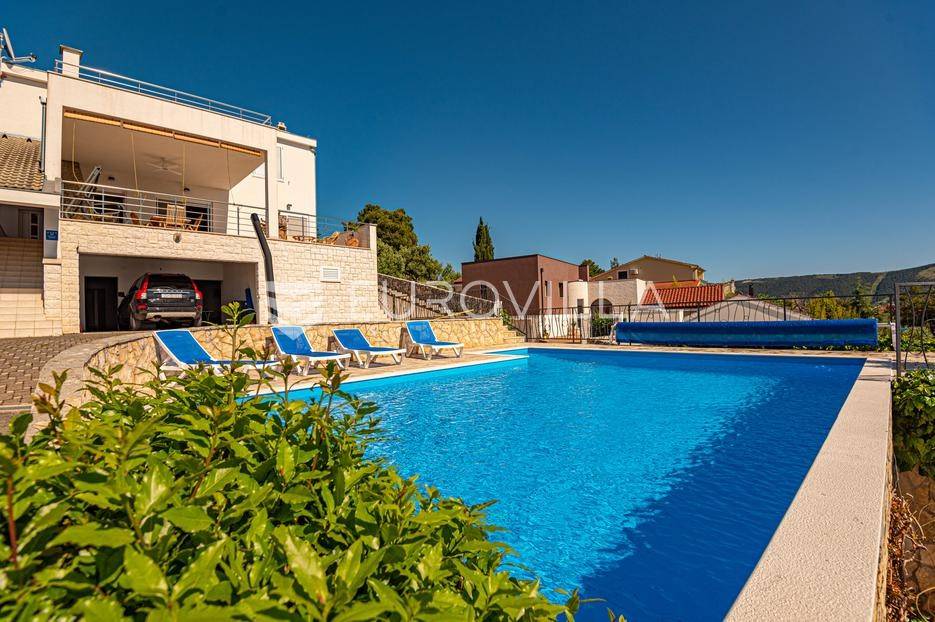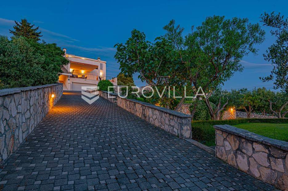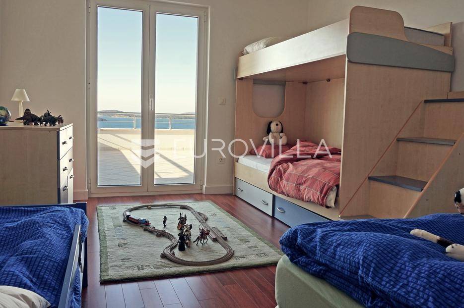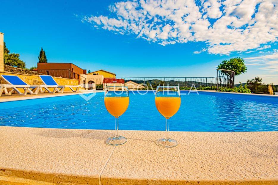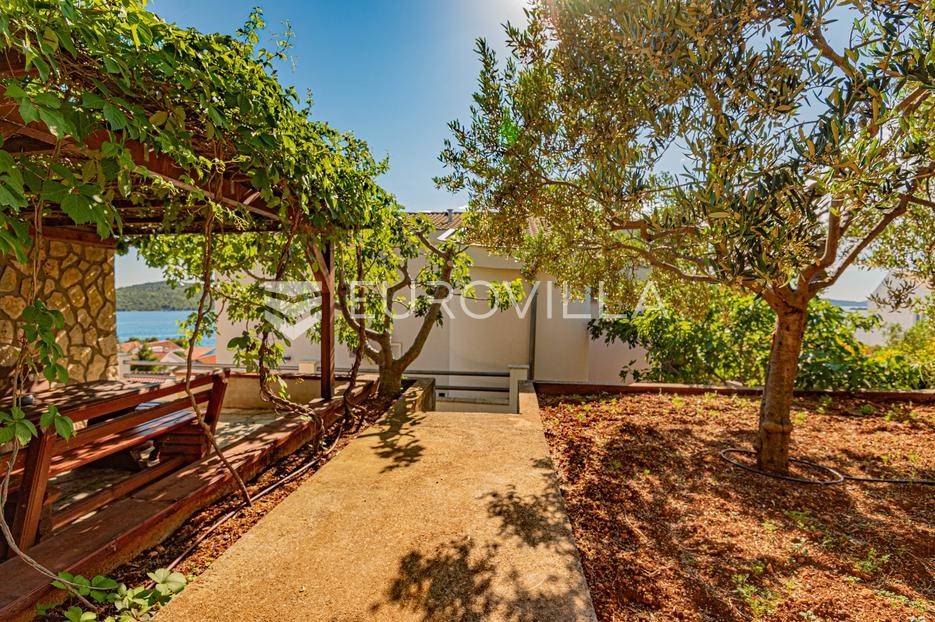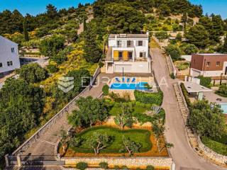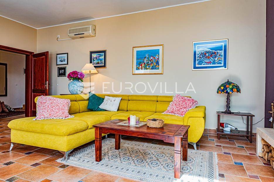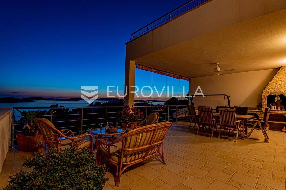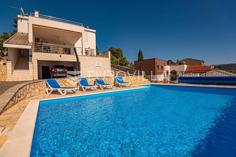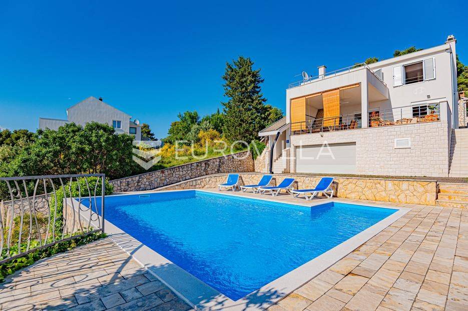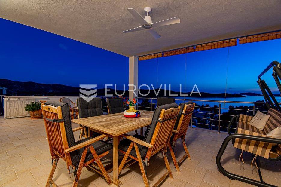 Šibenik, Žaborić, prekrasna kuća s bazenom i panoramskim pogledom na more, ukupne površine 438 m² izgrađena 2004. godine. Prodaje se potpuno namještena i opremljena, te idealna za odmor ili turistički najam.Izgrađena na parceli od 1215 m²., sastoji se od podruma u kojem je smještena garaža za dva automobile, strojarnica, konoba, te dva spremišta. U prizemlju se nalazi prostrani dnevni boravak s kuhinjom i blagovaonicom, spremište, vešeraj i toalet. Iz boravka se izlazi na veliku natkrivenu terasu s pogledom na more, na kojoj se nalazi komin i prostor za druženje. Na katu su smještene tri spavaće sobe od kojih svaka ima privatnu kupaonicu, a dvije sobe imaju i izlaz na terasu s pogledom na more.Kuća je građena po vrhunskim standardima, te je jako lijepo uređena. Okružena je jako lijepim vrtom koji je odlično uređen i održavan, te se u njemu nalazi i veliki bazen i prostor za sunčanje.Sve ostale informacije na upit.