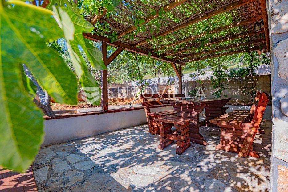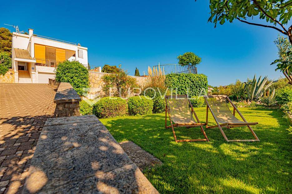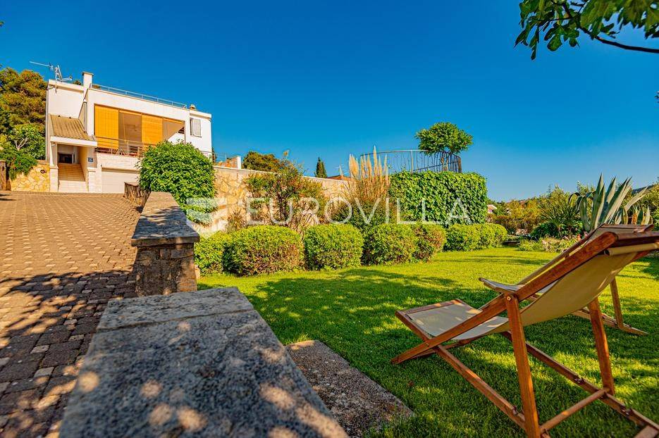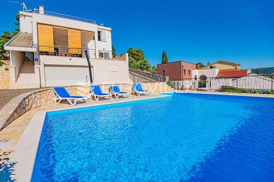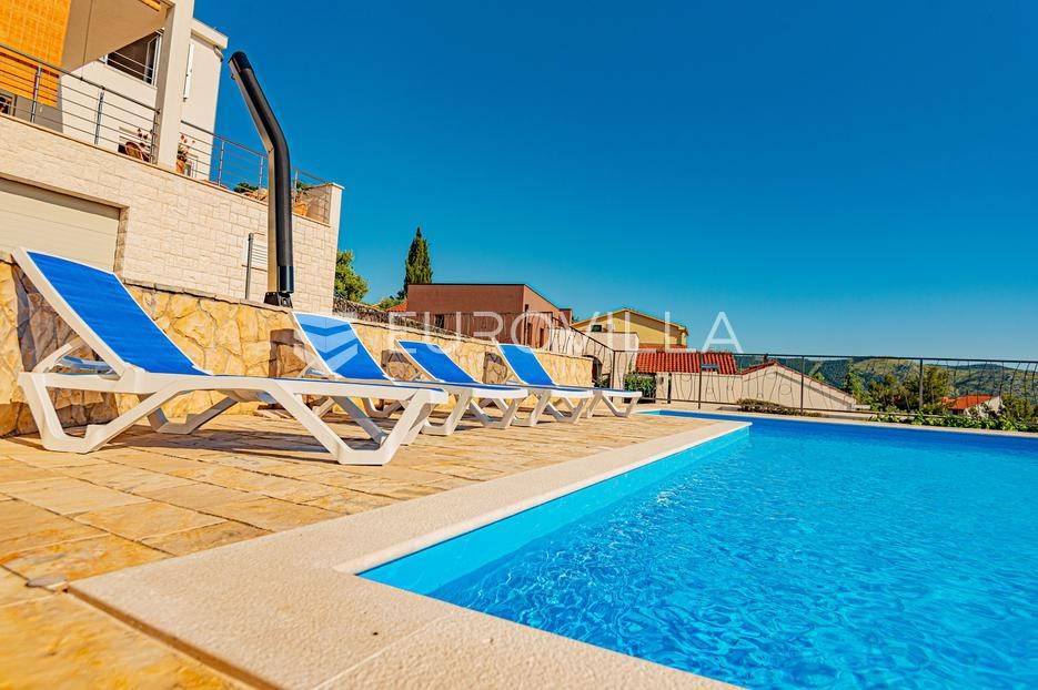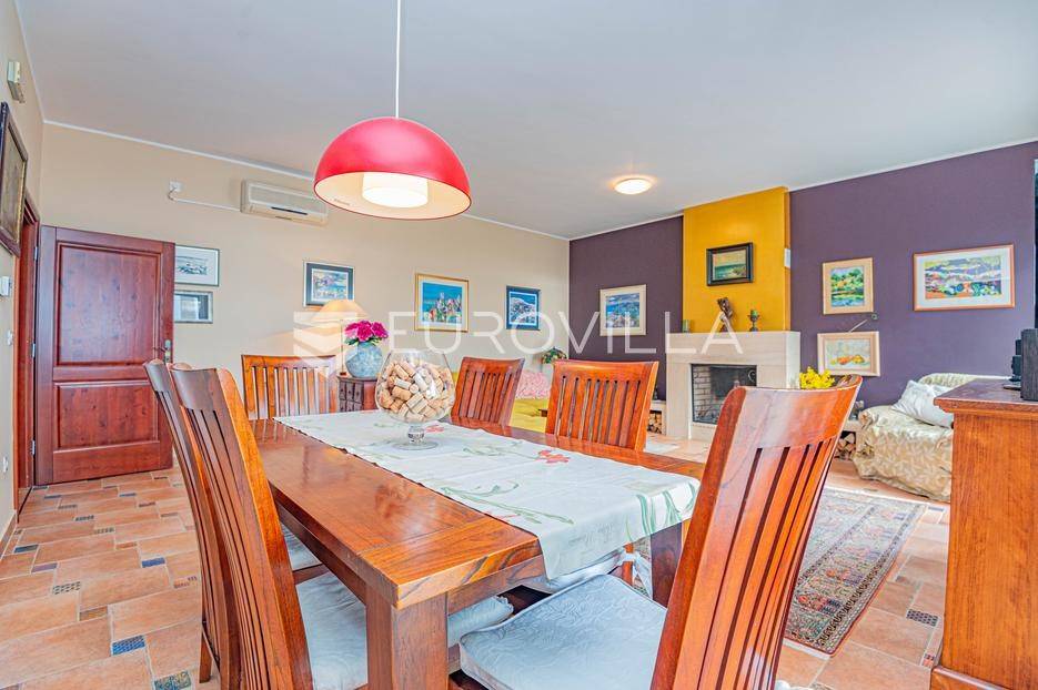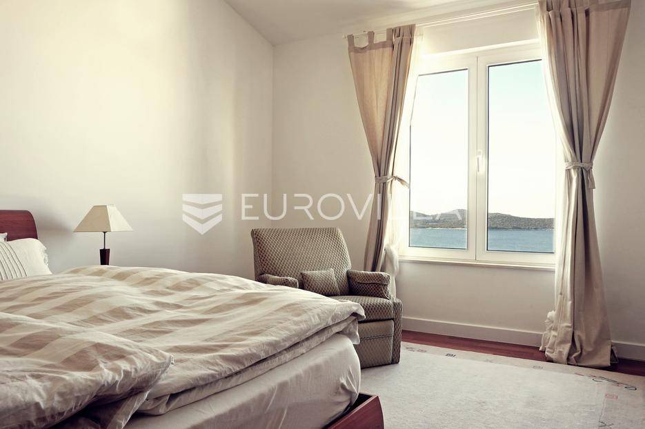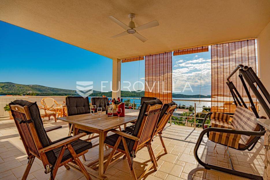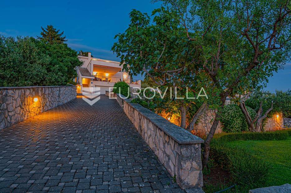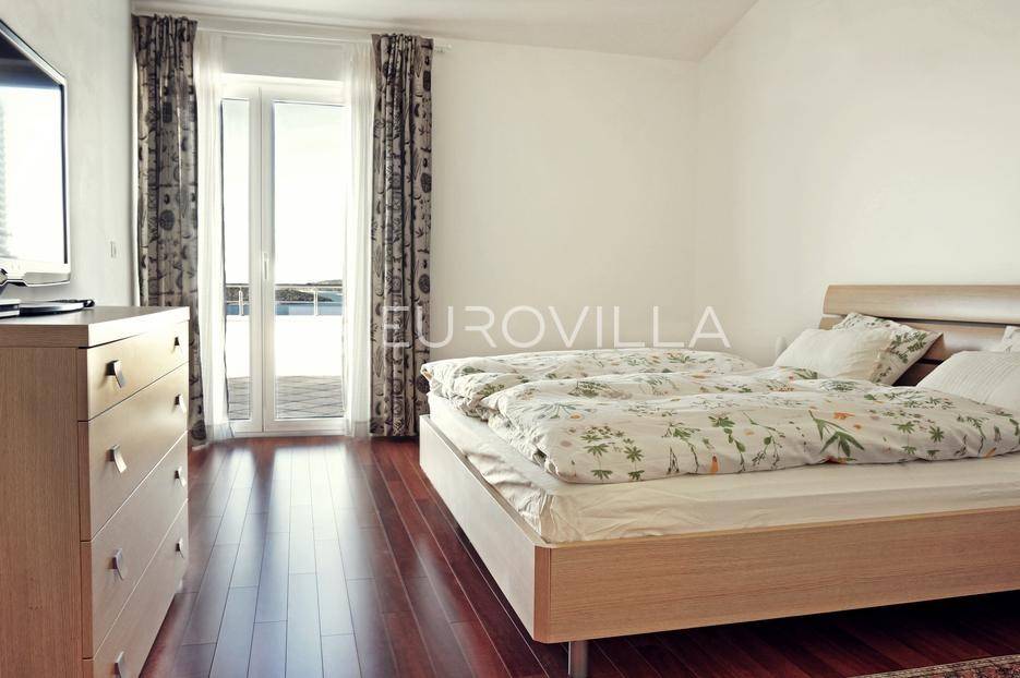Šibenik, Žaborić, prekrasna kuća s bazenom i panoramskim pogledom na more, ukupne površine 438 m² izgrađena 2004. godine. Prodaje se potpuno namještena i opremljena, te idealna za odmor ili turistički najam.Izgrađena na parceli od 1215 m²., sastoji se od podruma u kojem je smještena garaža za dva automobile, strojarnica, konoba, te dva spremišta. U prizemlju se nalazi prostrani dnevni boravak s kuhinjom i blagovaonicom, spremište, vešeraj i toalet. Iz boravka se izlazi na veliku natkrivenu terasu s pogledom na more, na kojoj se nalazi komin i prostor za druženje. Na katu su smještene tri spavaće sobe od kojih svaka ima privatnu kupaonicu, a dvije sobe imaju i izlaz na terasu s pogledom na more.Kuća je građena po vrhunskim standardima, te je jako lijepo uređena. Okružena je jako lijepim vrtom koji je odlično uređen i održavan, te se u njemu nalazi i veliki bazen i prostor za sunčanje.Sve ostale informacije na upit.