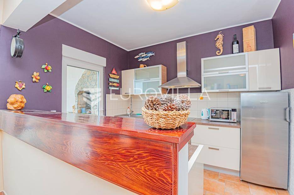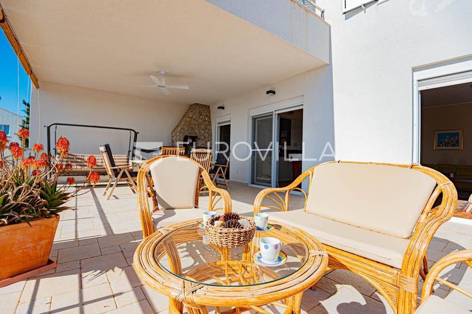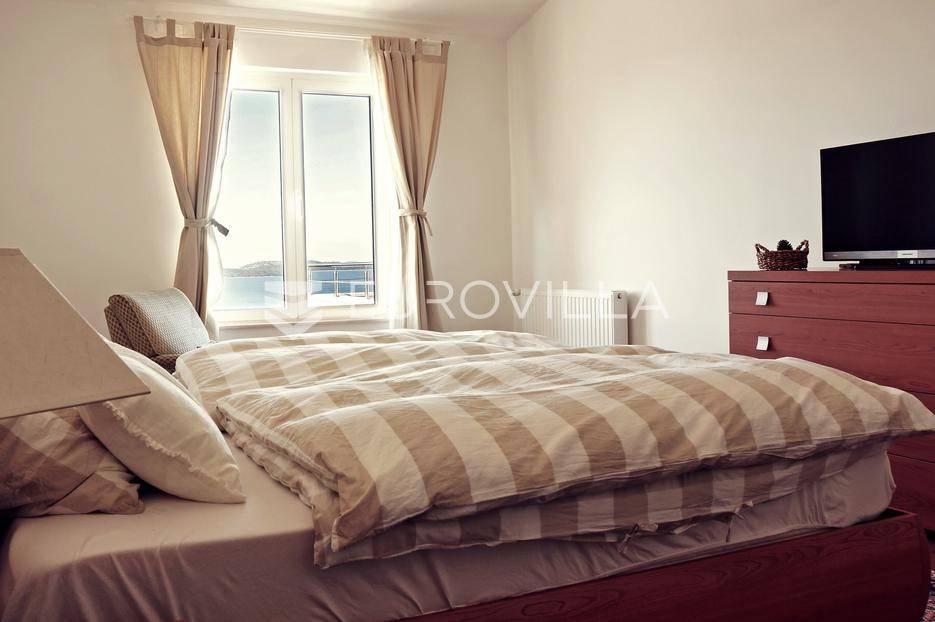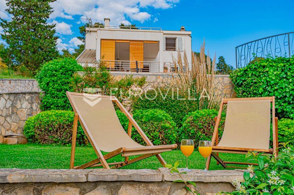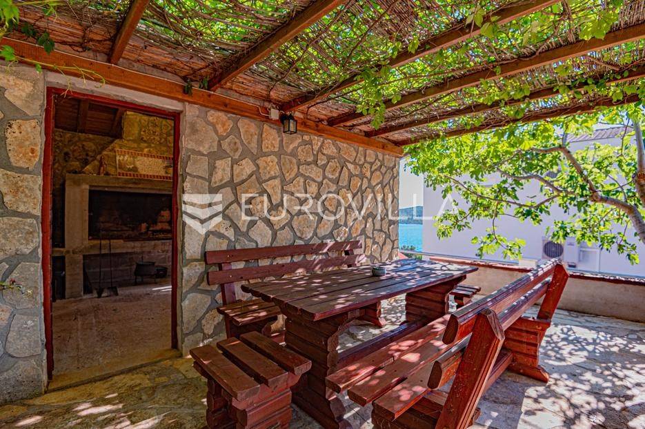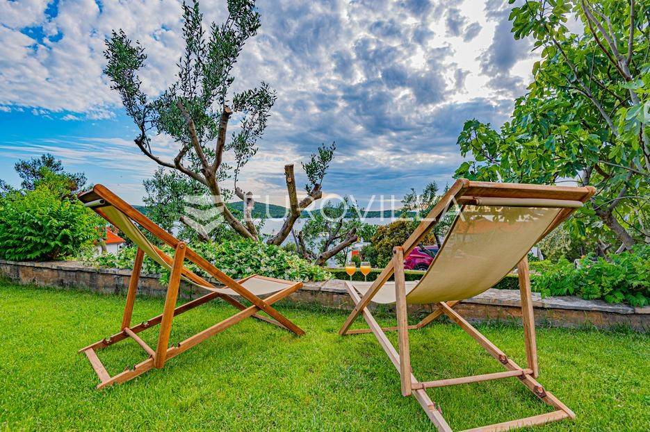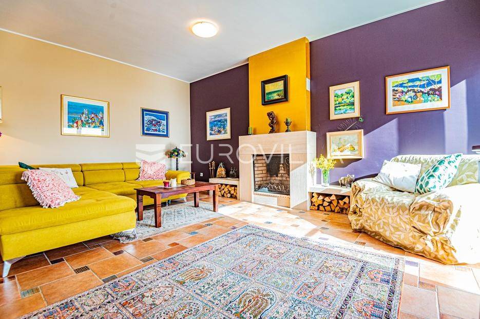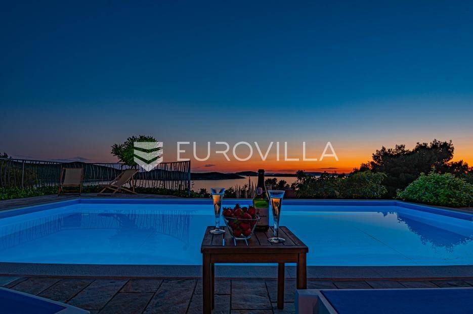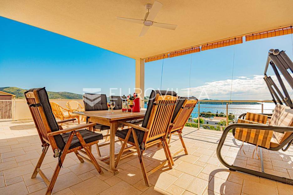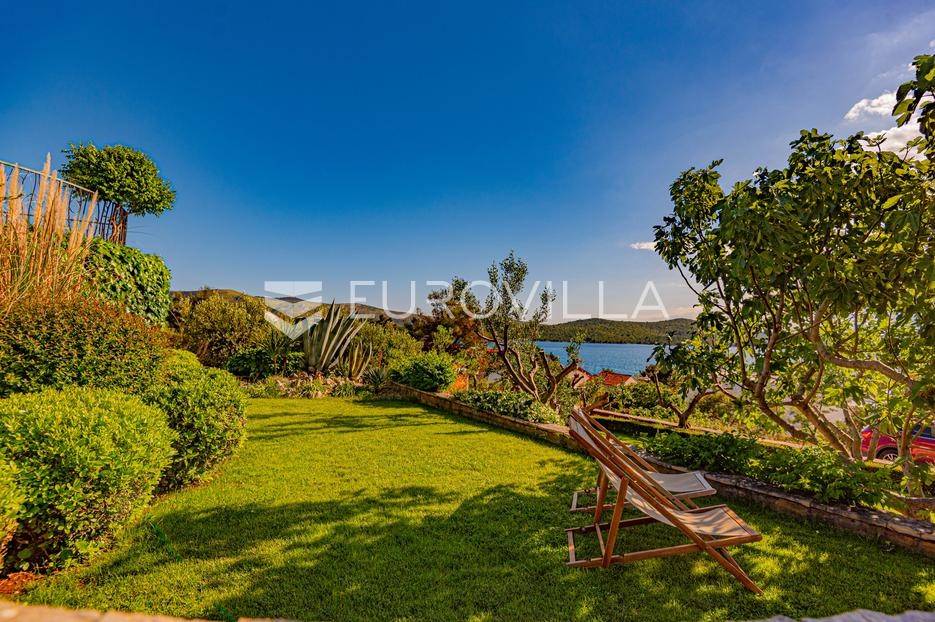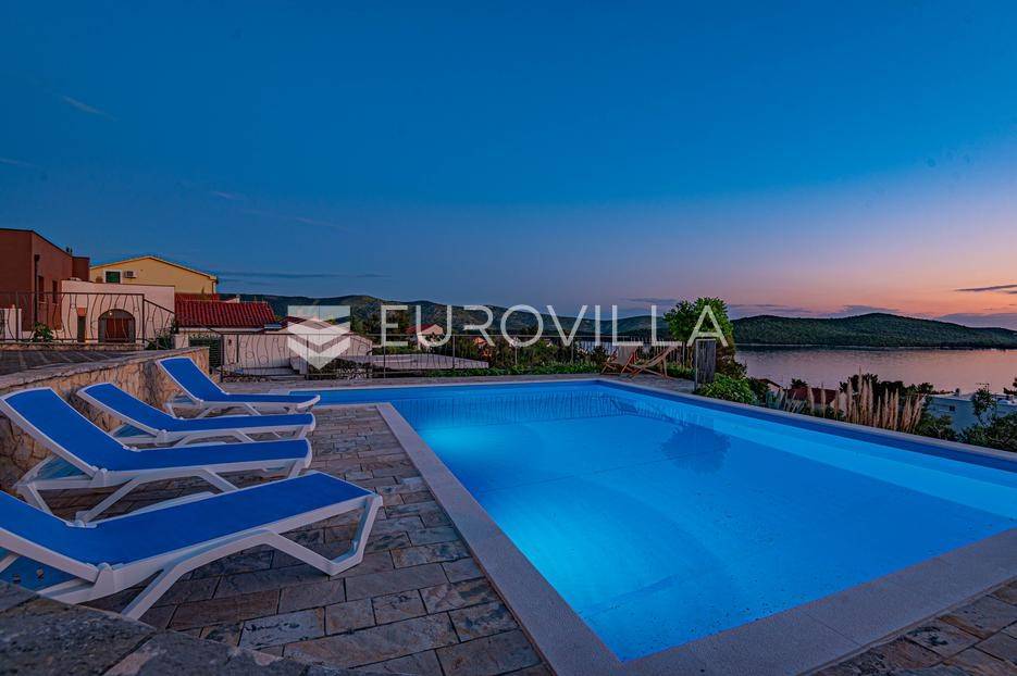 Šibenik, Žaborić, prekrasna kuća s bazenom i panoramskim pogledom na more, ukupne površine 438 m² izgrađena 2004. godine. Prodaje se potpuno namještena i opremljena, te idealna za odmor ili turistički najam.Izgrađena na parceli od 1215 m²., sastoji se od podruma u kojem je smještena garaža za dva automobile, strojarnica, konoba, te dva spremišta. U prizemlju se nalazi prostrani dnevni boravak s kuhinjom i blagovaonicom, spremište, vešeraj i toalet. Iz boravka se izlazi na veliku natkrivenu terasu s pogledom na more, na kojoj se nalazi komin i prostor za druženje. Na katu su smještene tri spavaće sobe od kojih svaka ima privatnu kupaonicu, a dvije sobe imaju i izlaz na terasu s pogledom na more.Kuća je građena po vrhunskim standardima, te je jako lijepo uređena. Okružena je jako lijepim vrtom koji je odlično uređen i održavan, te se u njemu nalazi i veliki bazen i prostor za sunčanje.Sve ostale informacije na upit.