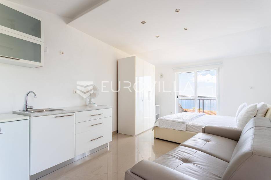 Gornja Podstrana, na lokaciji s atraktivnim pogledom nalazi se ova kuća idealna za život ili turistički najam.Sama kuća ima 110 m2 raspodijeljenih na ukupno tri etaže. Raspored prostorija nudi na svakom katu kuhinju i dnevni boravak s krevetom u produžetku prostorije, te kupaonicu i balkon ili terasu. Na zapadnoj strani kuće nalazi se veliki bazen sa sunčalištem s kojeg se pruža pogled na more.Kuća se nalazi na parceli od 350 m2 koja još uključuje bazen i sunčalište, vrt s maslinama i veliki parking. S balkona na prvom i drugom katu se pruža spektakularan panoramski pogled na Jadransko more i otoke. Južna orijentacija nekretnine i veliki prozori osiguravaju obilje sunca i prekrasne zalaske.Od mora je udaljena 1410 metara, a ima brz pristup jednoj od najpoznatijih plaža u Podstrani, dok povišena pozicija osigurava privatnost i mir.Za više informacija nas kontaktirajte