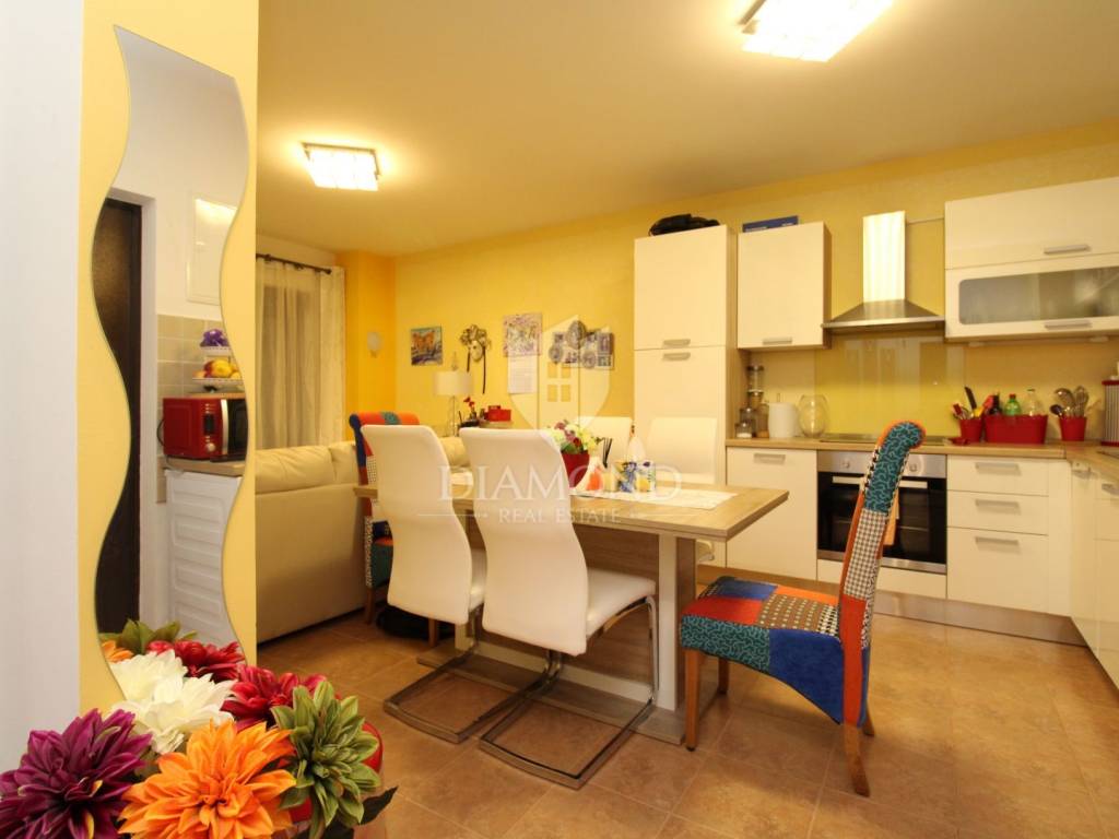 The apartment consists of a spacious living room, a kitchen with a dining area, two bedrooms, and a bathroom. Heating is central on gas, ensuring comfort throughout the year. The apartment also includes a large storage room, and parking is available in front of the building.