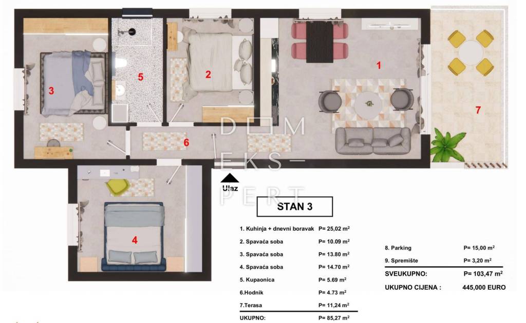 - 103.47 m2 – Gesamtfläche inkl. Terrasse, Parkplatz und Abstellraum