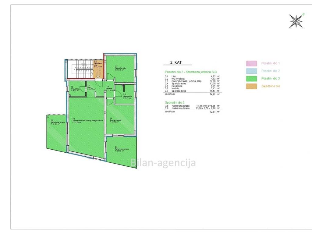 The apartment has a surface area of 74.11 m2. The terrace has a surface area of 25.00 m2. The surface area of two parking spaces is 27.00 m2. All together 126.00 m2.