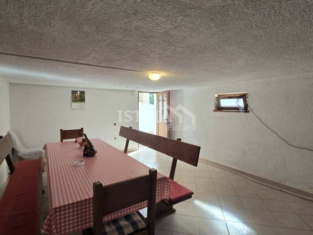 The ground floor of the house consists of a kitchen with a dining area, a spacious living room with a fireplace that opens onto a beautiful terrace overlooking the yard with olive trees, a storage room and a bathroom, while the first floor consists of a hallway, two bedrooms and a central bathroom.