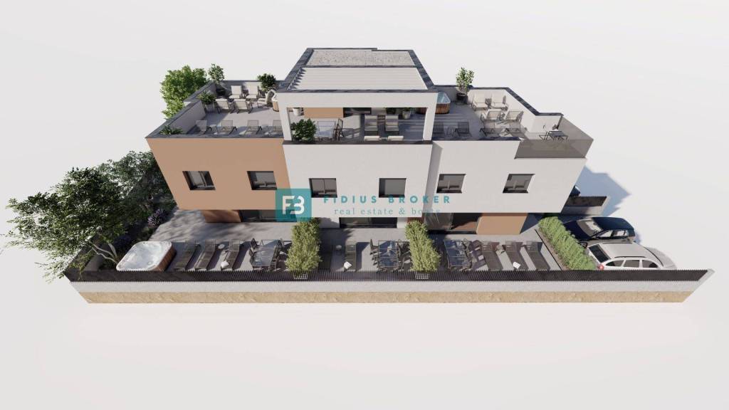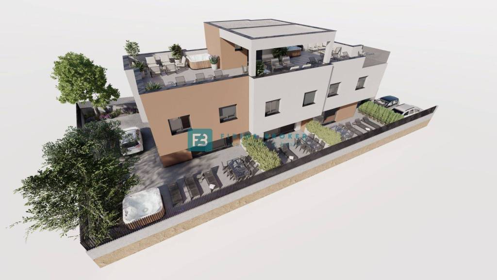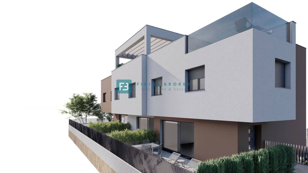 A modern building with a total of three separate residential units is located in the immediate vicinity of the city beach in the already built-up part of Vodice, surrounded by family houses. The building is located on a plot of 539 m2. It consists of three floors: ground floor with a courtyard/garden + 1st floor + roof terrace. The great advantage of this building is its functional layout, which offers greater privacy and more living space. An additional advantage is the private courtyard that each apartment has, as well as two parking spaces. The modernly designed building was built with high-quality materials according to the latest construction standards and includes: thermal facade, security entrance door, anthracite PVC windows, electric shutters and mosquito nets, electric underfloor heating in the bathrooms, modern sanitary elements, high-quality ceramic floors, high-quality laminate floors in the bedrooms, inverter air conditioners in all rooms, telephone and internet access, satellite TV and glass fences on the terraces. Each apartment has a separate entrance. The building is completed and ready to move in.