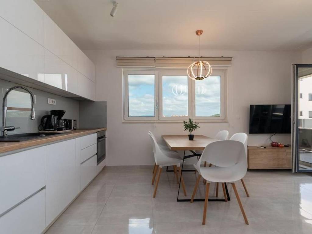 An attractive two bedroom apartment for rent located in a quiet and modernly decorated neighborhood in Trogir. The apartment is located on the second floor of a newly built residential building with an elevator, surrounded by similar new buildings and a quality landscaped environment. The total area of the apartment has 53,30 m², and the additional value is provided by a spacious balcony of 10,70 m² from which a partial view of the sea and the surrounding areas is offered. The apartment has a functional layout and consists of an entrance area and hallway, a modern bathroom with underfloor heating, two comfortable bedrooms and an open kitchen, dining room and living room with access to the balcony. The sleeping area of the apartment is oriented to the northeast, which ensures peace and a pleasant temperature during the warmer months, while the living area is oriented to the southeast, allowing plenty of natural light and a pleasant atmosphere throughout the day. The apartment is airconditioned and is rented fully furnished and equipped with high quality, modern furniture and is ready to move in immediately. The apartment comes with one outdoor parking space located behind the building. The building in which the apartment is located was built according to high standards – it is equipped with a video intercom, a security door, and the apartments also have a shared swimming pool and environment. This property represents an excellent opportunity for urban living. Thanks to its excellent location – close to all important facilities, beaches, restaurants and schools – the apartment offers a perfect combination of comfort, quality and affordability.