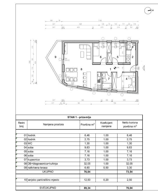 Četverosoban stan ukupne neto korisne površine 76,04 m2 smješten u prizemlju.Sastoji se od 2 hodnika, wc-a, 3 spavaće sobe, kupaonice, dnevnog boravka s blagovaonicom te kuhinje.Pripadaju mu natkrivena terasa i vanjsko parkirno mjesto.-----U okviru novogradnje planirana je izgradnja stambene zgrade s pet stambenih jedinica. Građevina nepravilnog tlocrta dimenzija 24,31 x 9,54 m, ukupne tlocrtne površine 172,31 m², sastoji se od prizemlja, dva kata i prednje terase na drugom katu. Ulaz je smješten s jugoistočne strane, a raspored stanova organiziran je tako da se u prizemlju i na prvom katu nalaze po dvije stambene jedinice, dok je na uvučenom drugom katu smješten jedan stan s pripadajućom terasom.