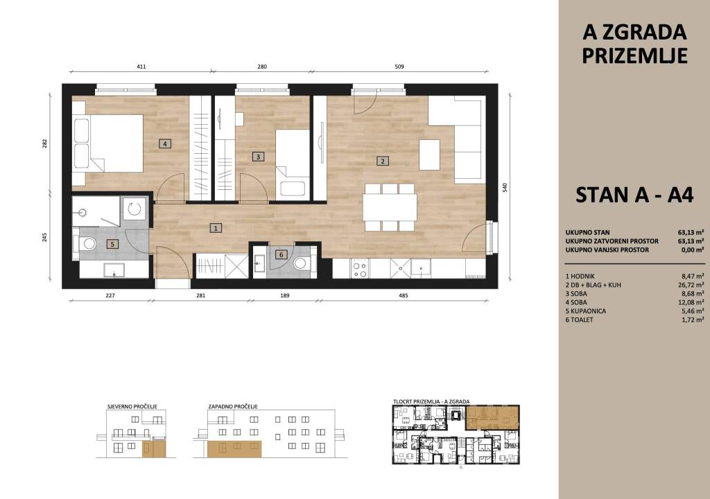 SVETA KLARA - LUKORANSKA ULICAModeran trosoban stan 66,26 m² u visokom prizemlju novogradnje - useljenje 05/2027.Na prodaju je stan oznake A4 koji se nalazi u visokom prizemlju zgrade A (ukupno 14 stanova). Stan se sastoji od:ulaznog hodnika,otvorenog prostora koji objedinjuje kuhinju, blagovaonicu i dnevni boravakdvije spavaće sobe,gostinjskog toalet,kupaonice.Stanu pripada nenatkriveno parkirno mjesto, uz mogućnost kupnje spremišta.Zgrada je izgrađena prema najvišim standardima moderne gradnje:Daikin dizalica topline za podno grijanje,hlađenje putem Daikin klima uređaja,PVC stolarija s trostrukim staklima i električnim roletama,fasadni sustav 12 cm,protuprovalna vrata,keramika prve klase,Galeković parketi,visina stropa 260 cm.Odlična mikrolokacija - u neposrednoj blizini nalaze se škola, vrtić, trgovine, autobusna linija, Savski most (tramvaj), Arena Centar, Avenue Mall i Bundek.Za dodatne informacije i razgled, stojimo vam na raspolaganju!