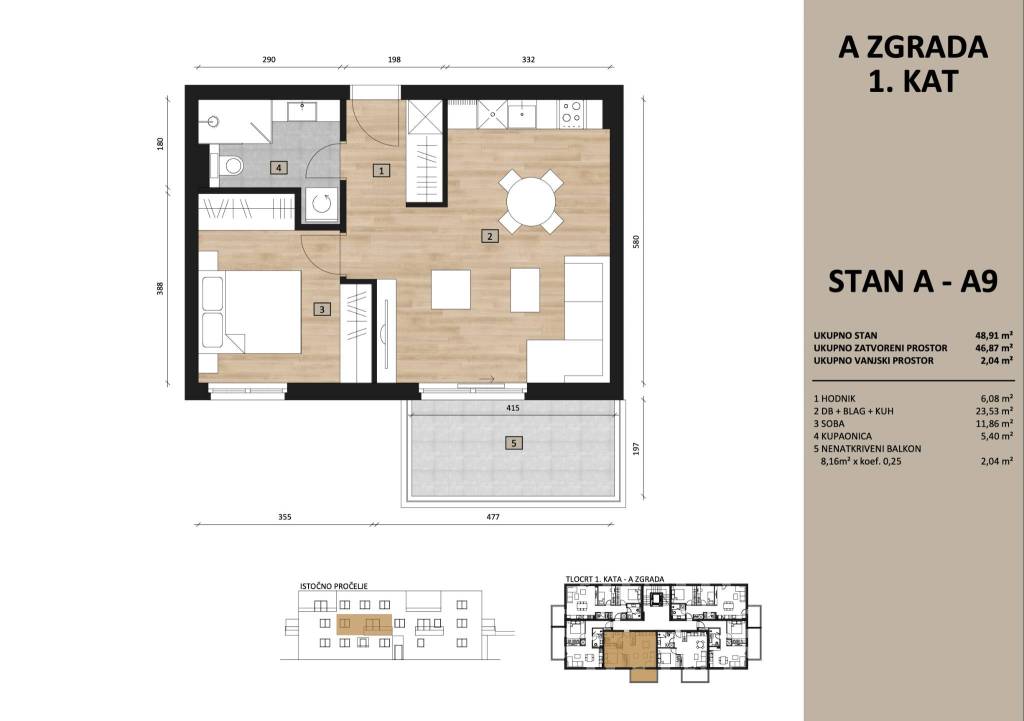SVETA KLARA - LUKORANSKA ULICAModeran dvosoban stan 52.04 m² na prvom katu novogradnje - useljenje 05/2027.Na prodaju je stan oznake A7 koji se nalazi na prvom katu zgrade A (ukupno 14 stanova).Stan se sastoji od:ulaznog hodnika,otvorenog prostora koji objedinjuje kuhinju, blagovaonicu i dnevni boravak s izlazom na nenatkriveni balkon od 8.16 m² (NKP 2.04 m²),spavaće sobe,kupaonice.Stanu pripada nenatkriveno parkirno mjesto, uz mogućnost kupnje spremišta.Zgrada je izgrađena prema najvišim standardima moderne gradnje:Daikin dizalica topline za podno grijanje,hlađenje putem Daikin klima uređaja,PVC stolarija s trostrukim staklima i električnim roletama,fasadni sustav 12 cm,protuprovalna vrata,keramika prve klase,Galeković parketi,visina stropa 260 cm.Odlična mikrolokacija - u neposrednoj blizini nalaze se škola, vrtić, trgovine, autobusna linija, Savski most (tramvaj), Arena Centar, Avenue Mall i Bundek.Za dodatne informacije i razgled, stojimo vam na raspolaganju!