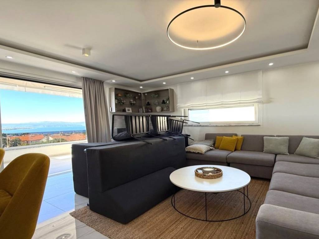 Otok Krk, Malinska, prodaja atraktivnog apartmana površine 79,85 m2, na drugom katu apartmanske zgrade s pogledom na more, 650 m od plaže. Apartman se sastoji od dvije spavaće sobe, dnevne sobe s kuhinjom i blagovaonom, kupaonicom, hodnikom i natkrivenom terasom od 17,51 m2. Kvalitetna gradnja i oprema, PVC stolarija, klimatizacija, namještaj po mjeri, protuprovalna vrata, parkirno mjesto.