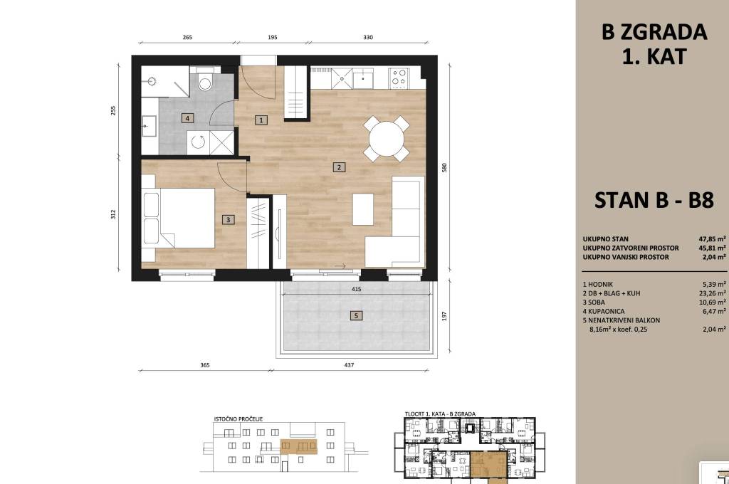 SVETA KLARA - LUKORANSKA ULICAModeran dvosoban stan 50.98 m² na prvom katu novogradnje - useljenje 05/2027.Na prodaju je stan oznake B8 koji se nalazi na prvom katu zgrade B (ukupno 14 stanova).Stan se sastoji od:ulaznog hodnika,otvorenog prostora koji objedinjuje kuhinju, blagovaonicu i dnevni boravak s izlazom na nenatkriveni balkon od 8.16 m² (NKP 2.04 m²),spavaće sobe,kupaonice.Stanu pripada nenatkriveno parkirno mjesto, uz mogućnost kupnje spremišta.Zgrada je izgrađena prema najvišim standardima moderne gradnje:Daikin dizalica topline za podno grijanje,hlađenje putem Daikin klima uređaja,PVC stolarija s trostrukim staklima i električnim roletama,fasadni sustav 12 cm,protuprovalna vrata,keramika prve klase,Galeković parketi,visina stropa 260 cm.Odlična mikrolokacija - u neposrednoj blizini nalaze se škola, vrtić, trgovine, autobusna linija, Savski most (tramvaj), Arena Centar, Avenue Mall i Bundek.Za dodatne informacije i razgled, stojimo vam na raspolaganju!