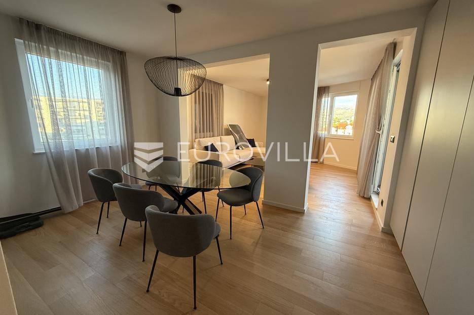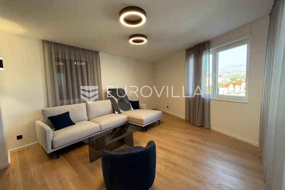 Split, Žnjan - moderan i prostran stan s pogledom na more te garažom i jednim garažnim mjestom dostupan je za dugoročan najam.Stan površine 90 m2 sastoji se od hodnika, tri spavaće sobe, kupaonice i WC-a, kuhinje, blagovaonice i dnevnog boravka s izlazom na loggiu.Stan se nalazi u tek dovršenoj novogradnji na Žnjanu u blizini svih sadržaja potrebnih za miran život. Režije nisu uključene u cijenu najma.Više informacija na upit.