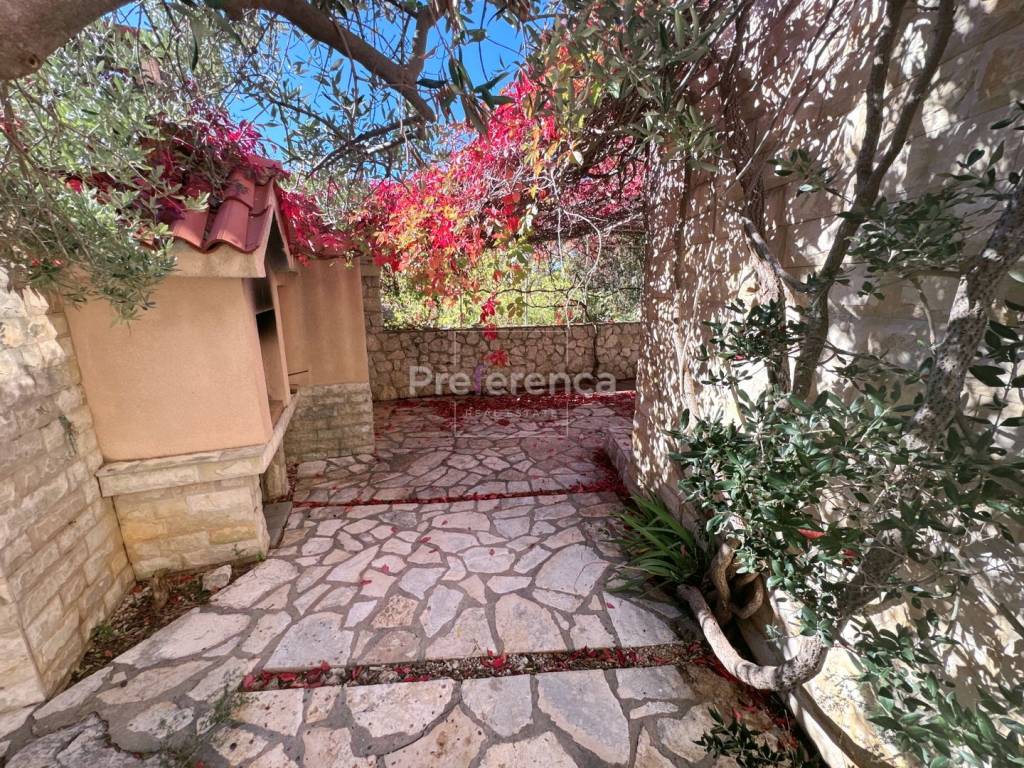The courtyard is paved with stone, landscaped with Mediterranean plants, and decorated with olive trees. Part of the garden is covered with a pergola with greenery that provides a pleasant natural shade, perfect for summer relaxation and socializing.