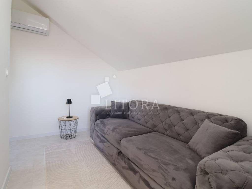 Vodice – Close to the Center, One-Bedroom Apartment with Large Terrace. The apartment, with a total area of 46.02 m², is located on the top floor of a residential building with a total of six apartments, just 400 meters from the city center and 900 meters from the beach. The apartment is south-facing and consists of: a spacious covered terrace of 21.40 m², an interior space of 24.78 m², including a living room, bedroom, bathroom, and kitchen, a balcony of 3.20 m². It has been fully renovated and is completely furnished with new furniture, which is included in the purchase price. The building has a spacious parking area, sufficient for all apartments in the building. The parking spaces are not assigned. The apartment is located on a quiet cul-de-sac, ensuring peace and privacy, while still being close to all amenities in the center of Vodice.