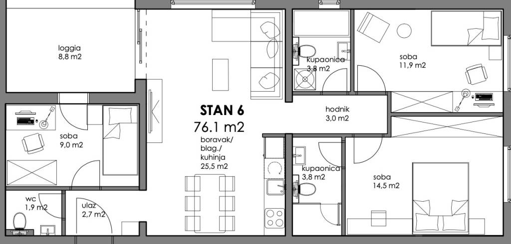 Sastoji se od ulaza, 2 kupaonice, wc-a, 3 spavaće sobe, dnevnog boravka, kuhinje s blagovaonicom te lođe.