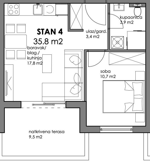Sastoji se od ulaza/garderobe, kupaonice, spavaće sobe, dnevnog boravka, kuhinje s blagovaonicom te natkrivene terase.