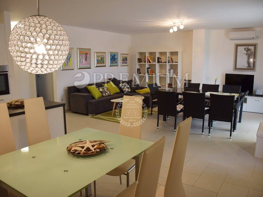The house was built in 2016 on a 608 m2 plot. On the ground floor there is a hall, a kitchen with a dining area and a living room, a bathroom, a bedroom and two rooms for a tavern and a wine cellar. On the ground floor there is a spacious living room, kitchen with dining area, two bathrooms, two bedrooms and a covered terrace pd 18m2. On the spacious garden there is a walled barbecue, a covered summer kitchen and sunbathing area with a swimming pool of 24 m2. From the ground floor and the floor there is a beautiful panoramic sea view. In the garden there is a garage and several parking spaces. Fully furnished.