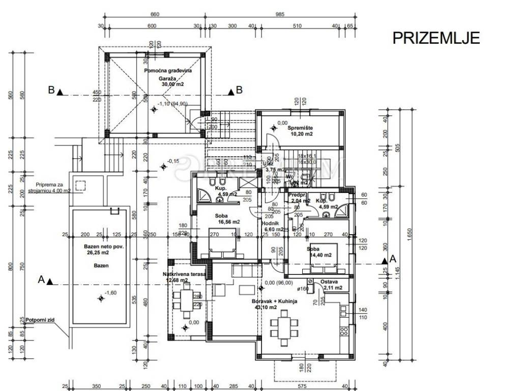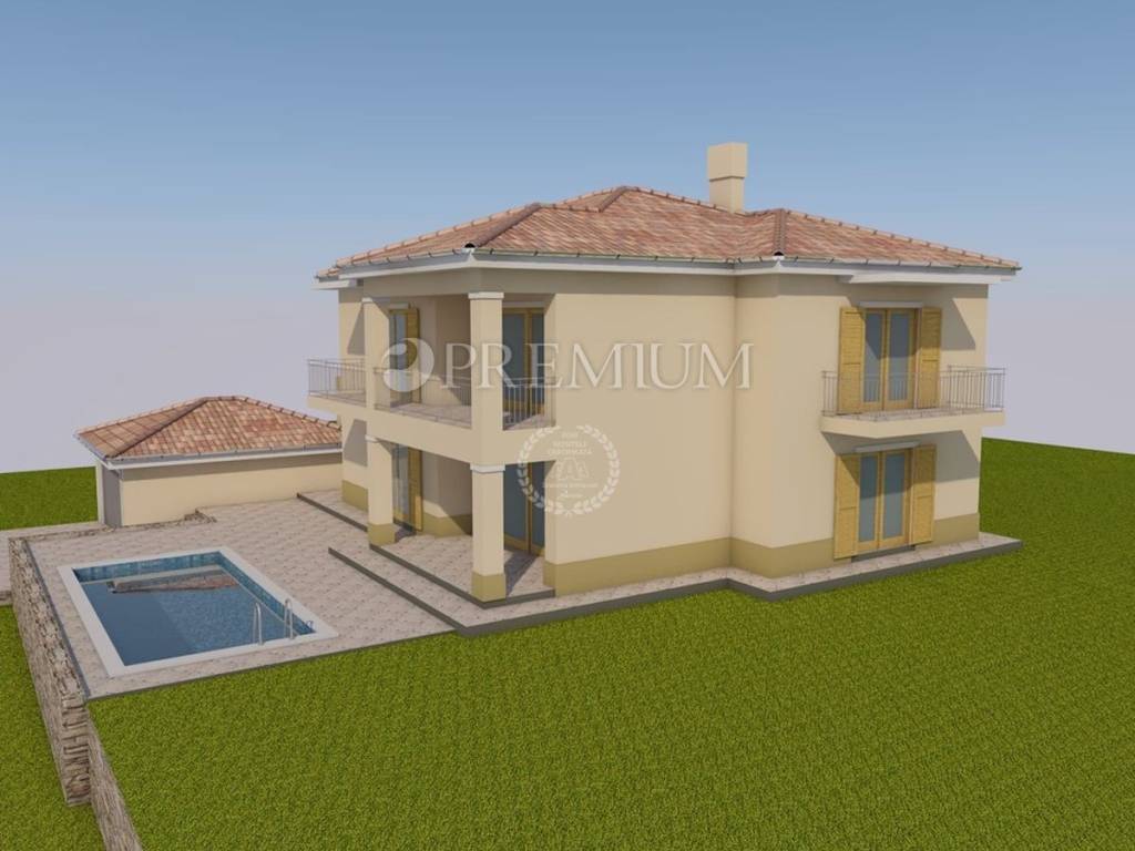 Građevinsko zemljište površine 1144 m2, s pravomoćnom građevinskom dozvolom za rušenje postojeće kuće, i za izgradnju samostojeće kuće s dvije stambene jedinice, bruto površine 295 m2, s garažom površine 37 m2, i bazenom, dimenzija 4 m x 8 m.