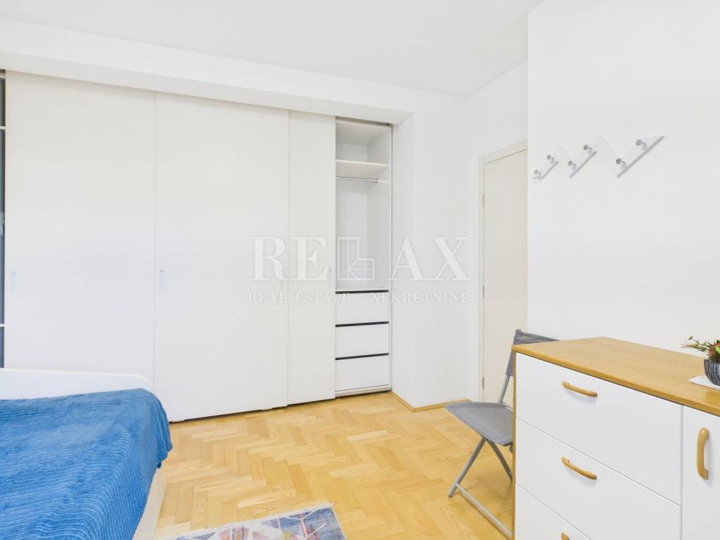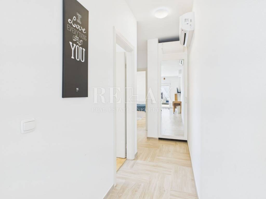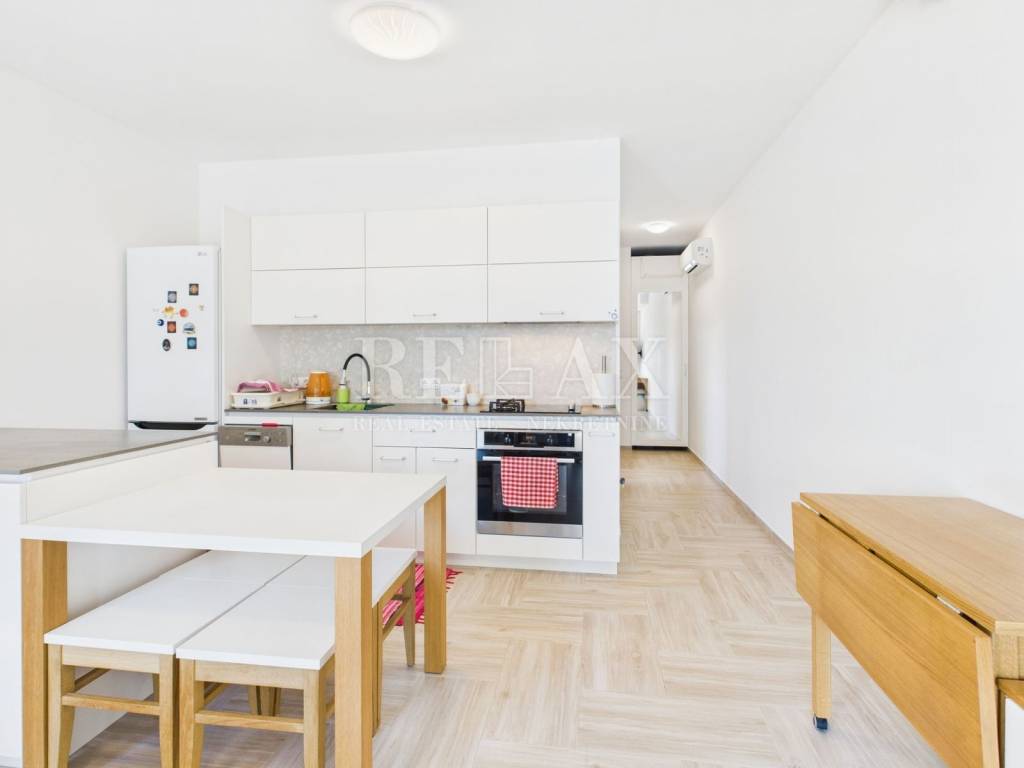 The apartment consists of a living room connected to the kitchen and dining area, two bedrooms, a hallway, and a bathroom. Its southern orientation ensures plenty of natural light throughout the day, while the light interior tones create a sense of airiness and comfortable living. The space is air-conditioned, and a parking space in front of the building is available for use.