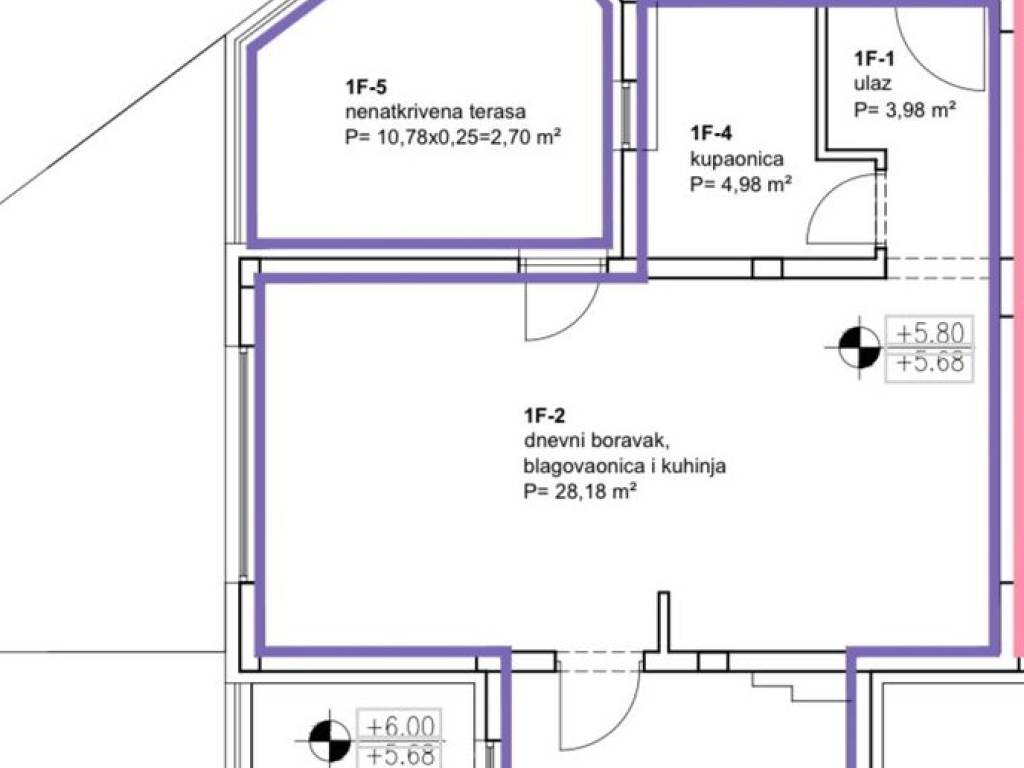 Sastoji se od ulaznog prostora, dnevnog boravka s kuhinjom i blagovaonicom, spavaće sobe, kupaonice te dvije terase.