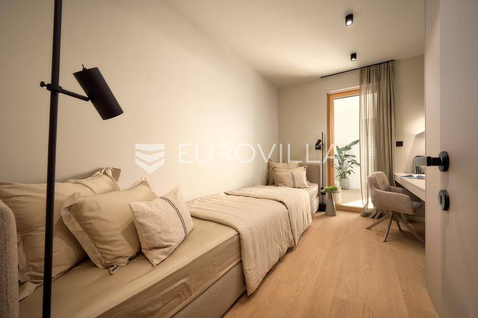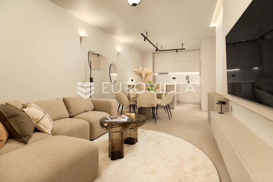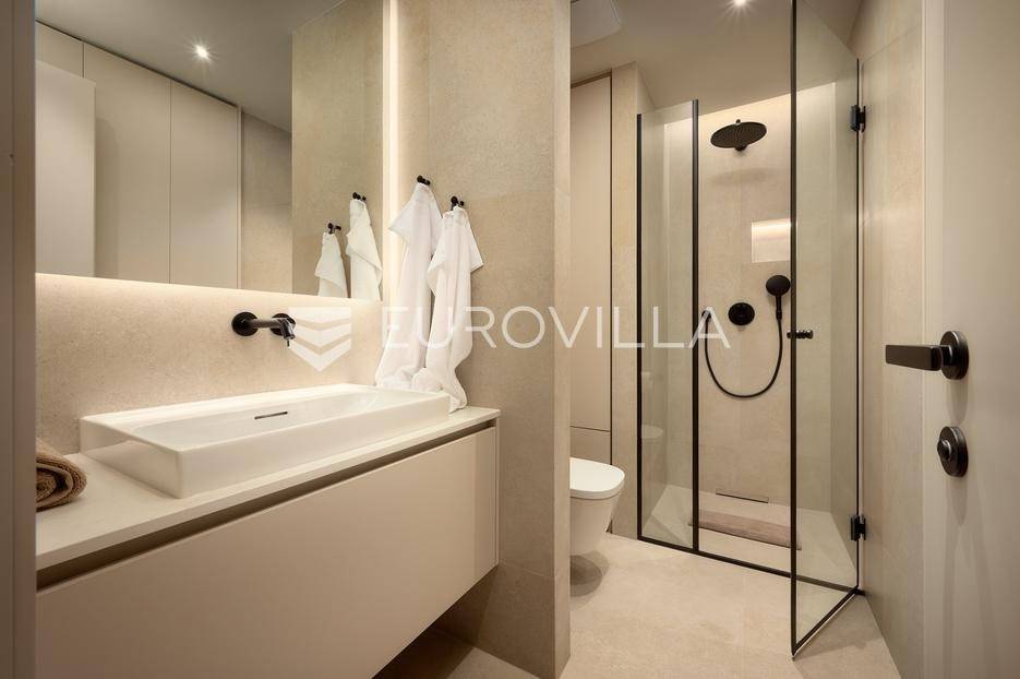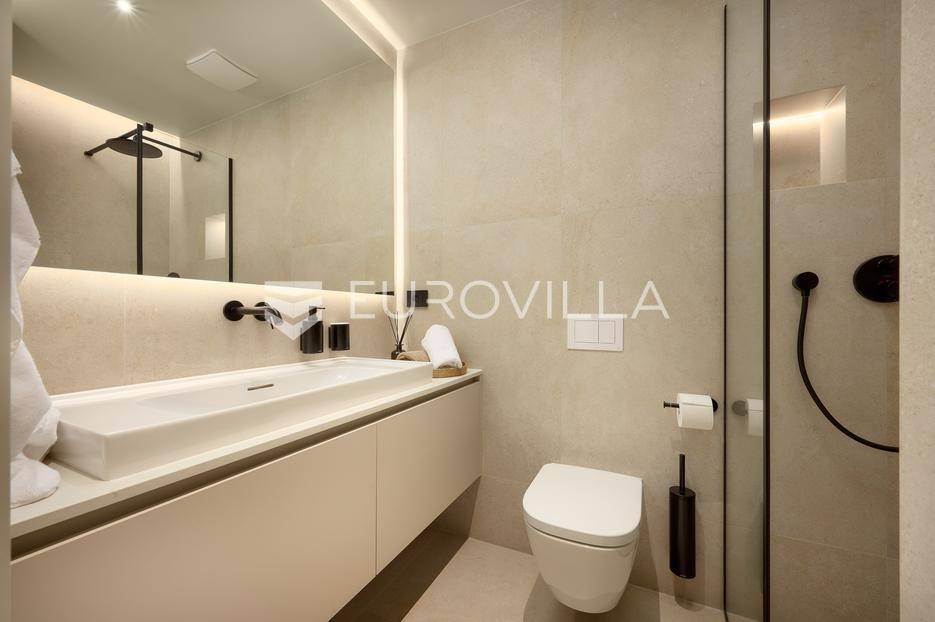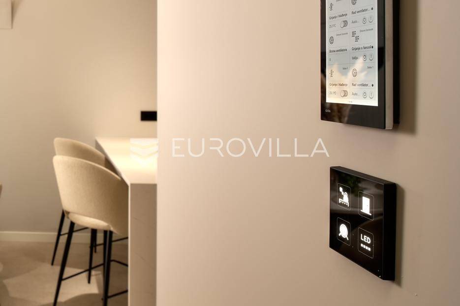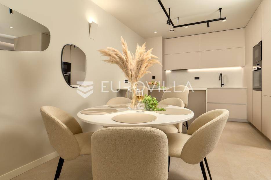 Split, Duilovo, luksuzno uređen i potpuno opremljen dvosoban stan s pogledom na more u novoizgrađenom objektu 'Bel Etage 2'.Položen je na šestom katu, a sastoji se od ulaznog hodnika, dvije spavaće sobe, od kojih je jedna master s vlastitom kupaonicom, druga soba je opremljena s dva jednostruka kreveta i radnim stolom, gostinjske kupaonice, open space dnevnog dijela podjeljenog na kuhinju s otokom, blagovaonicu i dnevni boravak, s izlazom na loggiu površine 18m2. Pripadaju mu dva parkirna mjesta u garaži objekta, koji su liftom povezani sa stanom.Opremljen je Miele aparatima najnovije generacije ( svi kuhinjski aparati, perilica i sušilica rublja ), vodenim podnim grijanjem u cijelom stanu, Daikin klimatizacijski uređajima ( svaka prostorija u stanu je klimatizirana ), kompletno dizajniran od strane renomiranog arhitektonskog studija, upotpunjen svim potrebnim stvarima za svakodnevni život ( posteljina, ručnici, posuđe, beštek, razne dekoracije ).Ulaz u zgradu je omogućen Keyless sistemom s pomoću digitalnog otiska prsta. Recepcija je na usluzi 24/7, a svi stanari uživaju ekskluzivan pristup potpuno opremljenoj teretani, sauni i dvorani za jogu ili pilates unutar kompleksa.Lokacija na Duilovu nudi savršenu ravnotežu mira i blizine urbanih sadržaja. Uživajte u pješačkoj udaljenosti do plaža, restorana i trgovina, s izvrsnom povezanošću s centrom Splita.Za sve ostale informacije, stojimo Vam uvijek na raspolaganju.