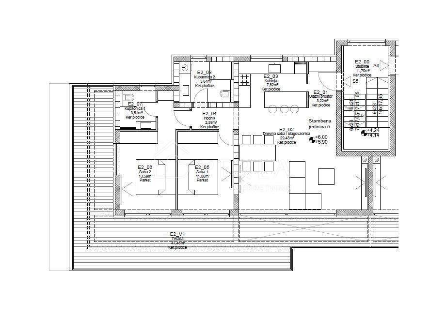 Apartment number 5 is located on the 2nd floor and has 2 bedrooms, 2 bathrooms, a kitchen, a dining room and a large living room, as well as a roof terrace with a kitchen and preparation for a jacuzzi.