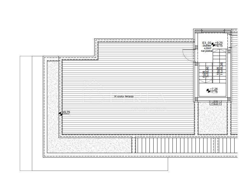 The total residential net usable area is 113 m2, the area of the roof terrace is 77 m2.