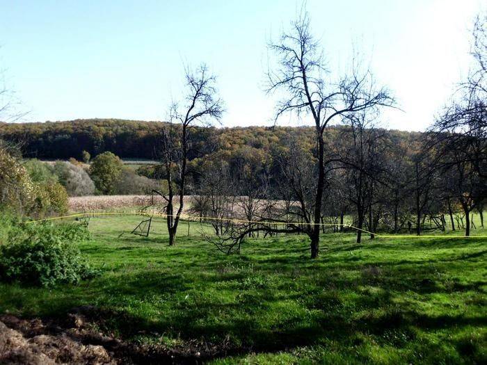 Parcelu od 2.428 m2 čine lijepo, ravno dvorište i voćnjak u blagoj nizbrdici.