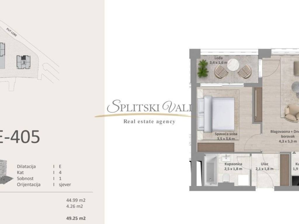 Projekt Lora - Luksuzna novogradnja u užem centru Splita. Predstavljamo Projekt L68°, ekskluzivnu gradnju smještenu u samom srcu Splita.Zgrada je osmišljena prema najvišim standardima kvalitete i udobnosti, s brojnim inovativnim rješenjima koja je izdvajaju na tržištu. Ovo je prva zgrada u Splitu s uvedenim plinskim sustavom, vodenim grijanjem i multi-split klimatizacijom, čime se osigurava maksimalna energetska učinkovitost i komfor stanovanja. Zgrade projekta Lora po standardu i dizajnu usporedive su s hotelima s pet zvjezdica. U izgradnji se koriste najkvalitetniji materijali, a svaki detalj pažljivo planiran kako bi se postigla vrhunska estetika i funkcionalnost.U sklopu projekta bit će recepcija i teretana namijenjene stanarima. Projekt obuhvaća više građevinskih cjelina:- Glavni neboder: dvije podzemne etaže parkirnih mjesta, suteren, prizemlje i 10 katova- Dvojna zgrada: dvije podzemne etaže parkirnih mjesta, suteren, prizemlje i 6 katova- Manji stambeni objekt: dvije podzemne etaže parkirnih mjesta, suteren, prizemlje i dva kataOvaj ambiciozni projekt donosi novi standard stanovanja u Splitu - spoj luksuza, udobnosti i vrhunske tehnologije u središtu grada.Stan E405 - jednosoban stan, ukupne površine 49,25 m2, nalazi se na 4. katu od ukupnih 10. Stan je sjeverne orijentacije i sastoji se od spavaće sobe, kupatila, kuhinje, dnevnog boravka s blagovaonicom i lođe. Velike staklene stijenke u stanu pružaju mnogo osvjetljenja tokom dana i lijep pogled iz samog stana. Stanu pripada i parking mjesto u garaži (35.000€) i sprema koja se nalazi u suterenu (22 000€). Razgled nekretnine moguć je isključivo uz potpisani Ugovor o posredovanju, a što je u skladu sa Zakonom o zaštiti podataka i Zakonom o posredovanju i prometu nekretninama. Kupac plaća posredničku naknadu od 2%+pdv. Za više informacija obratite se na 0915002178 Ana.
