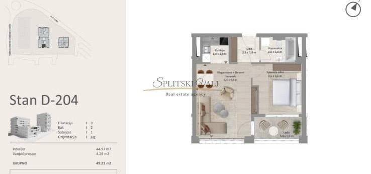 Projekt Lora - Luksuzna novogradnja u užem centru Splita. Predstavljamo Projekt L68°, ekskluzivnu gradnju smještenu u samom srcu Splita.Zgrada je osmišljena prema najvišim standardima kvalitete i udobnosti, s brojnim inovativnim rješenjima koja je izdvajaju na tržištu. Ovo je prva zgrada u Splitu s uvedenim plinskim sustavom, vodenim grijanjem i multi-split klimatizacijom, čime se osigurava maksimalna energetska učinkovitost i komfor stanovanja. Zgrade projekta Lora po standardu i dizajnu usporedive su s hotelima s pet zvjezdica. U izgradnji se koriste najkvalitetniji materijali, a svaki detalj pažljivo planiran kako bi se postigla vrhunska estetika i funkcionalnost.U sklopu projekta bit će recepcija i teretana namijenjene stanarima. Projekt obuhvaća više građevinskih cjelina:- Glavni neboder: dvije podzemne etaže parkirnih mjesta, suteren, prizemlje i 10 katova- Dvojna zgrada: dvije podzemne etaže parkirnih mjesta, suteren, prizemlje i 6 katova- Manji stambeni objekt: dvije podzemne etaže parkirnih mjesta, suteren, prizemlje i dva kataOvaj ambiciozni projekt donosi novi standard stanovanja u Splitu - spoj luksuza, udobnosti i vrhunske tehnologije u središtu grada.Stan D204 - jednosoban stan, ukupne površine 49,21 m2, nalazi se na drugom katu od ukupnih dva kata stambene zgrade . Stan je južne orijentacije i sastoji se od predsoblja, spavaće sobe, kupatila, kuhinje, dnevnog boravka s blagovaonicom i lođe. Velike staklene stijenke u stanu pružaju mnogo osvjetljenja tokom dana i lijep pogled iz samog stana. Stanu pripada i parking mjesto u garaži (35.000€) i sprema koja se nalazi u suterenu (25 000€). Razgled nekretnine moguć je isključivo uz potpisani Ugovor o posredovanju, a što je u skladu sa Zakonom o zaštiti podataka i Zakonom o posredovanju i prometu nekretninama. Kupac plaća posredničku naknadu od 2%+pdv. Za više informacija obratite se na 0993202222 Antea.